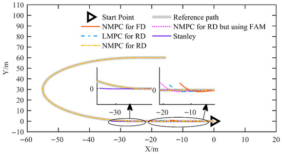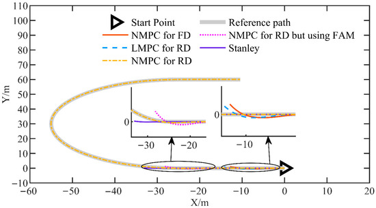 In this simulation, the performance of the proposed NMPC for reverse driving (NMPC for RD) was evaluated at a speed of 2 m/s and compared with that of four other control strategies, including NMPC for forward driving (NMPC for FD), NMPC for reverse driving based on the front axle model (NMPC for RD using FAM), linear MPC for reverse driving (LMPC for RD), and the Stanley controller. The reference trajectory was designed as a U-shaped path consisting of straight segments and circular arcs with a radius of 30 m. As shown in Figure 5, the reference path and trajectory tracking results demonstrate that only the proposed NMPC scheme successfully followed the desired trajectory, while all other control methods failed to track the path effectively.