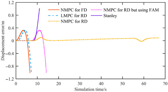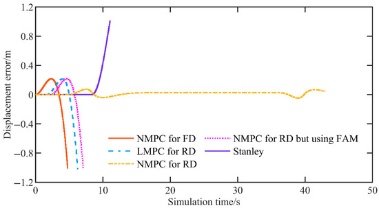 Figure 11 shows the displacement error. The proposed NMPC achieves a mean displacement error of 0.0175 m and a maximum displacement error of 0.0743 m. In contrast, all other control methods exhibit divergent behavior.