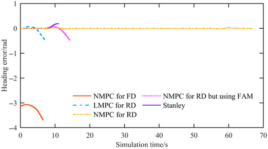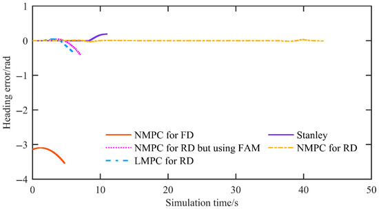 Figure 12 shows the heading error. For the proposed NMPC, the mean heading error is 0.000349 rad and the maximum heading error is 0.0372 rad, whereas all other control methods diverge.