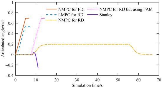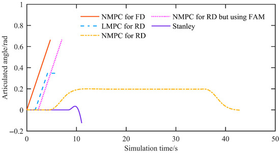 Figure 8 presents the articulated angle. The proposed reverse-driving NMPC keeps the articulated angle within the system constraints, and its rate of change does not exceed the articulated angle rate limit. The forward driving NMPC and other MPC-based methods also stay within the bounds; however, both the articulated angle and its rate of change operate at the boundary of the angle and rate constraints, indicating a loss of stability. With Stanley control, the rate of change in the articulated angle shows steep slopes and clearly violates the articulated angle rate constraint.