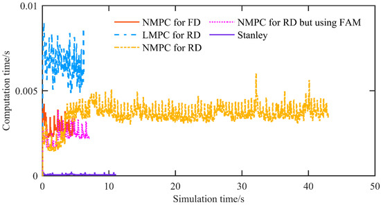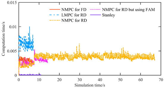 Figure 14 shows the controller computation time per control period. For the proposed NMPC, the average and maximum solver times are 0.0036 s and 0.0059 s, respectively, satisfactorily meeting the real-time requirements of the control period.