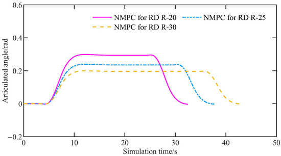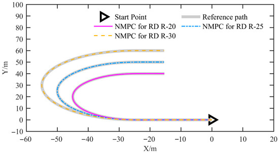 In this set of simulations, we tested the proposed NMPC at a speed of 3 m/s in U-shaped curves with radii of 20 m (NMPC for RD R-20), 25 m (NMPC for RD R-25), and 30 m (NMPC for RD R-30). Figure 15 illustrates the reference path corresponding to U-shaped curves with different radii, as well as the path tracking results obtained using the proposed NMPC. It is evident that, regardless of the radius of the U-shaped curve, the proposed NMPC is capable of accurately tracking the reference path.