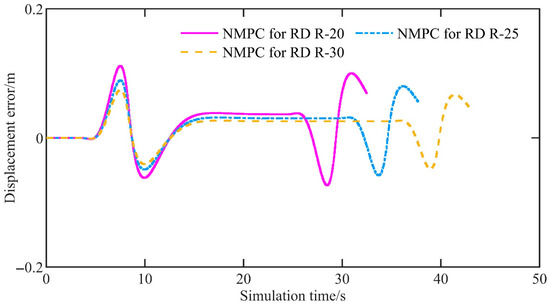 Figure 16 shows the displacement error. For NMPC for RD R-30, NMPC for RD R-25, and NMPC for RD R-20, the mean displacement errors are 0.017 m, 0.019 m, and 0.021 m, and the maximum amplitudes are 0.074 m, 0.089 m, and 0.112 m, respectively. It is evident that, as the curvature of the U-shaped curve increases (i.e., as the radius decreases), both the mean and maximum displacement errors increase. Of course, the increase is minimal.