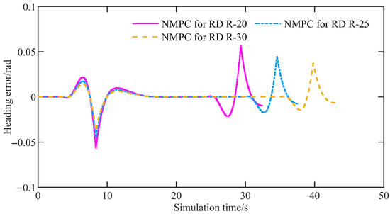 Figure 17 shows the heading error. For the three cases above, the mean heading errors are 0.000347 rad, 0.000484 rad, and 0.000688 rad, and the maximum amplitudes are 0.0372 rad, 0.0447 rad, and 0.0565 rad, respectively. Likewise, as the curvature of the U-shaped curve increases, both the mean and maximum heading errors increase. Of course, the increase is minimal.