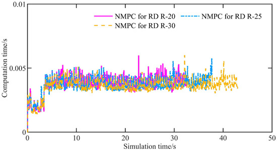 Figure 19 shows the controller computation time per control period. For NMPC for RD R-30, NMPC for RD R-25, and NMPC for RD R-20, the average computation times are 0.0036 s, 0.0037 s, and 0.0037 s, while the maximum computation times are 0.0060 s, 0.0058 s, and 0.0060 s, respectively. The results demonstrate that the computation time remains relatively stable as the curvature of the U-shaped curve increases. Furthermore, the average solver iteration counts are 4.97, 5.03, and 5.22, with worst-case iteration counts of 7, 9, and 9, respectively.
