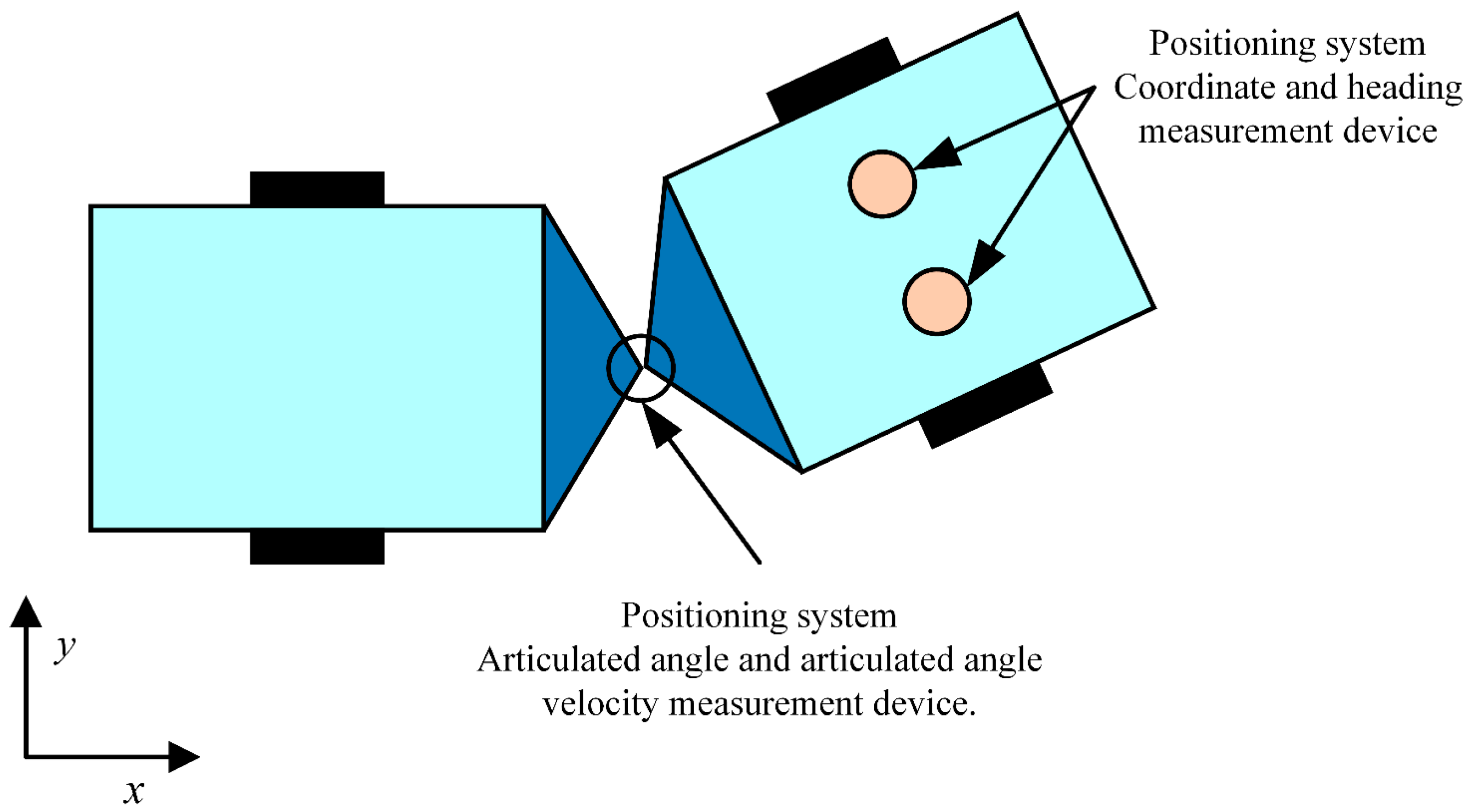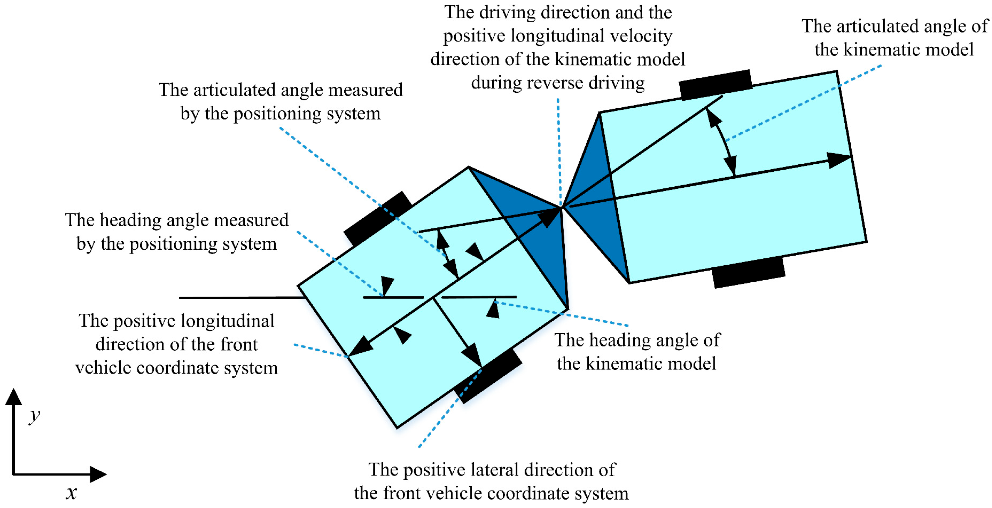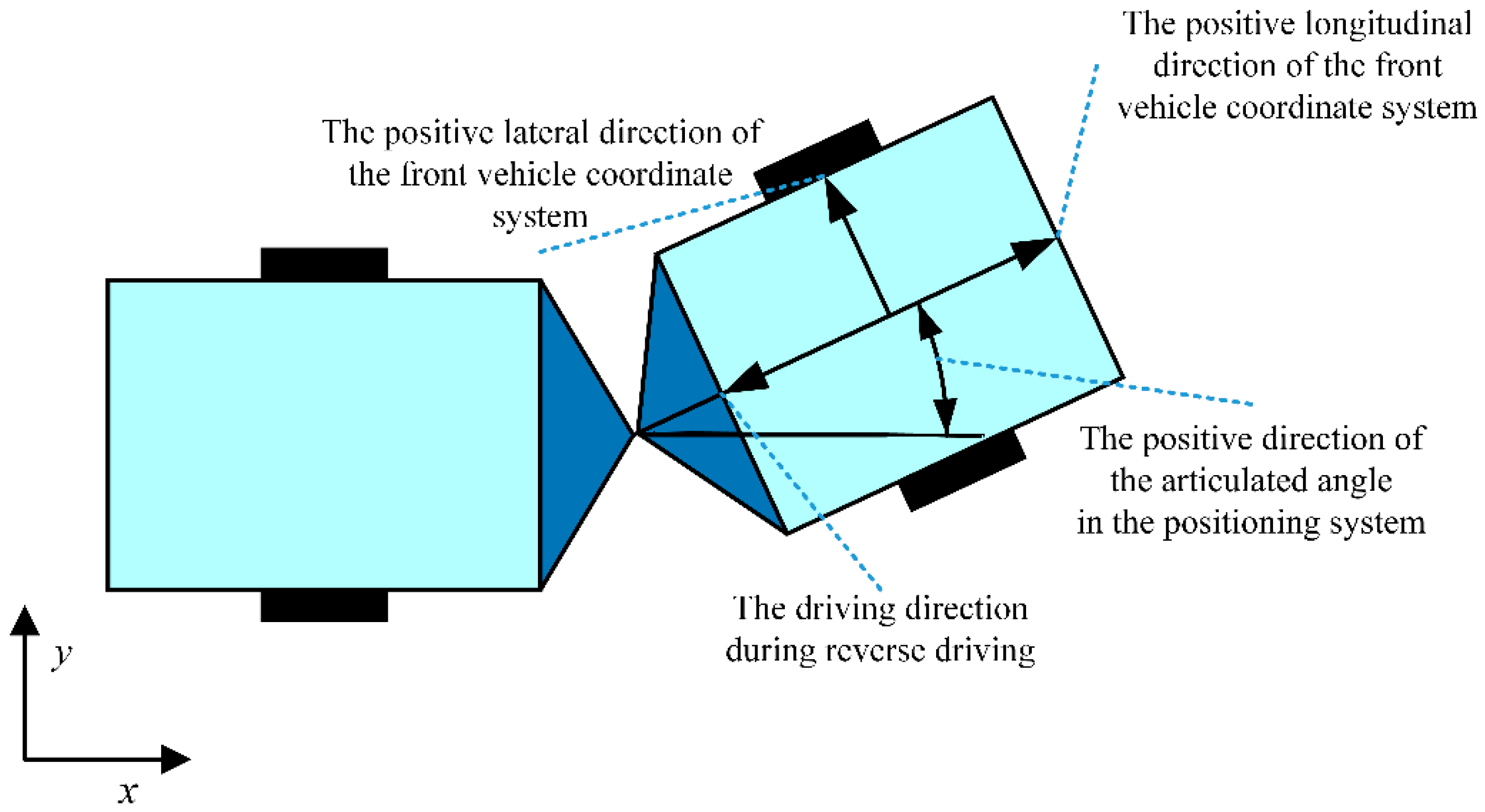 Figure 3 demonstrates the positive direction of the positioning system. The positive directions of the heading angle, yaw rate, articulated angle, and articulation rate are defined as counterclockwise. The articulated angle is the difference between the heading angle of the front vehicle and that of the rear vehicle.