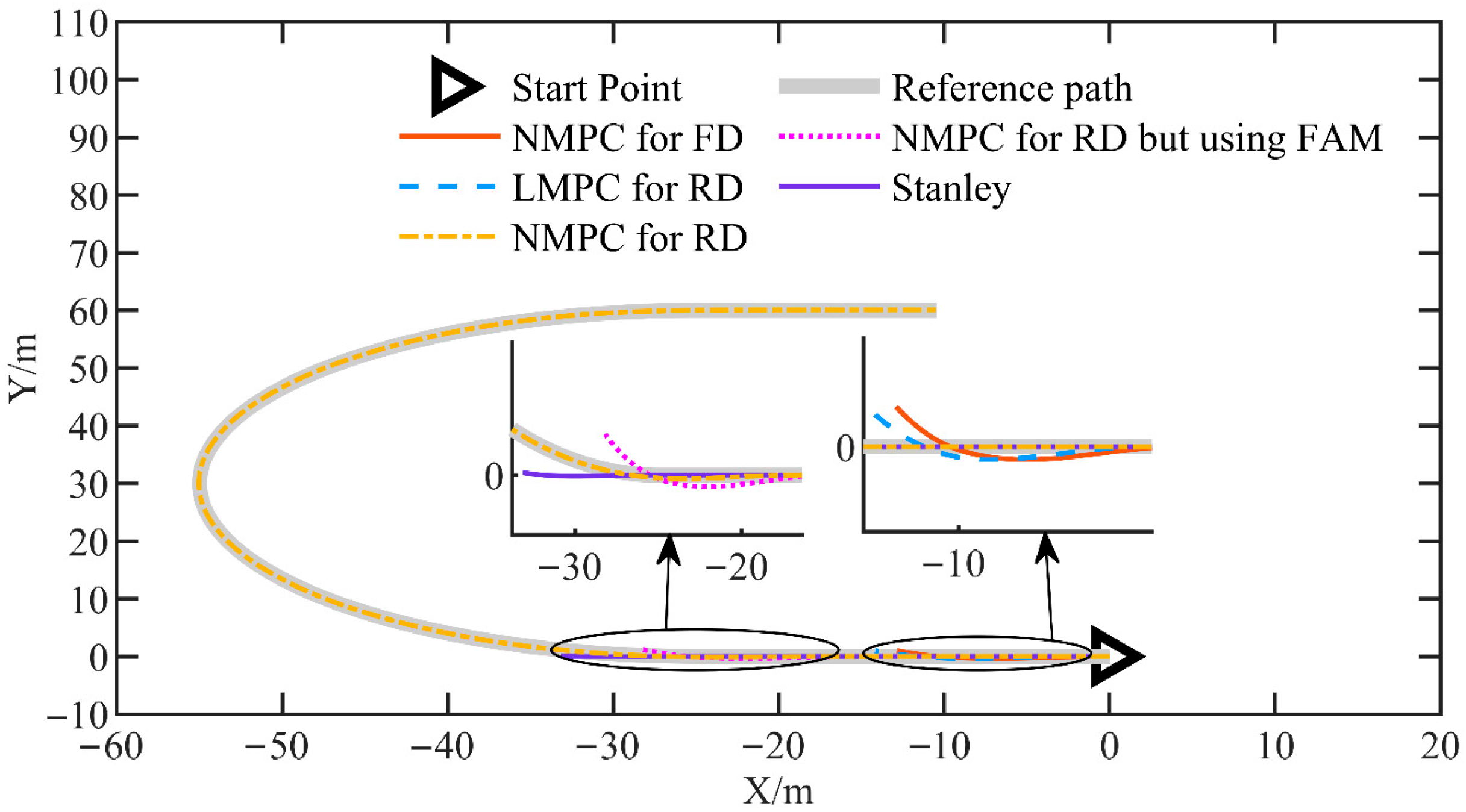 Secondly, the proposed NMPC method can better adapt to reverse driving conditions compared to other methods. Simulation results indicate that other control methods are ineffective in adapting to reverse driving conditions during path tracking. At the same time, the proposed NMPC successfully addresses this issue, better adapting to the reverse driving conditions and maintaining high control accuracy during reverse path tracking.