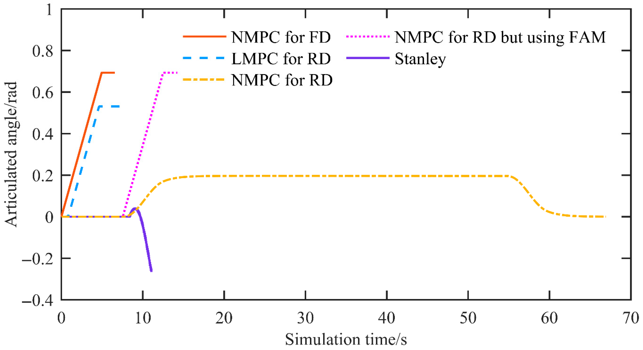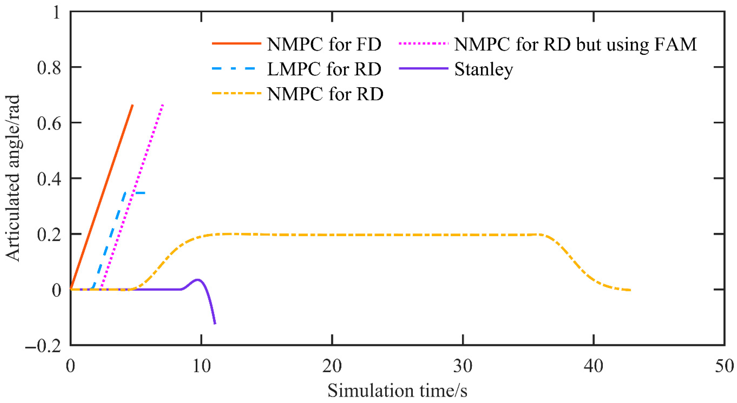 The proposed NMPC also has limitations and potential failure modes. The principal limitations concern real-time performance and the cost of industrial deployment. Its real-time capability is relatively weak, necessitating reliance on high-performance computing platforms for practical implementation and potentially rendering deployment prohibitively expensive in industrial settings. A potential failure mode arises when the vehicle speed is excessively high and the required steering exceeds the steering mechanism’s constraints on articulation angle or on the rate of change in the articulation angle. In such circumstances, not only the NMPC controller but virtually any controller cannot circumvent these physical limits to accomplish path tracking control.
