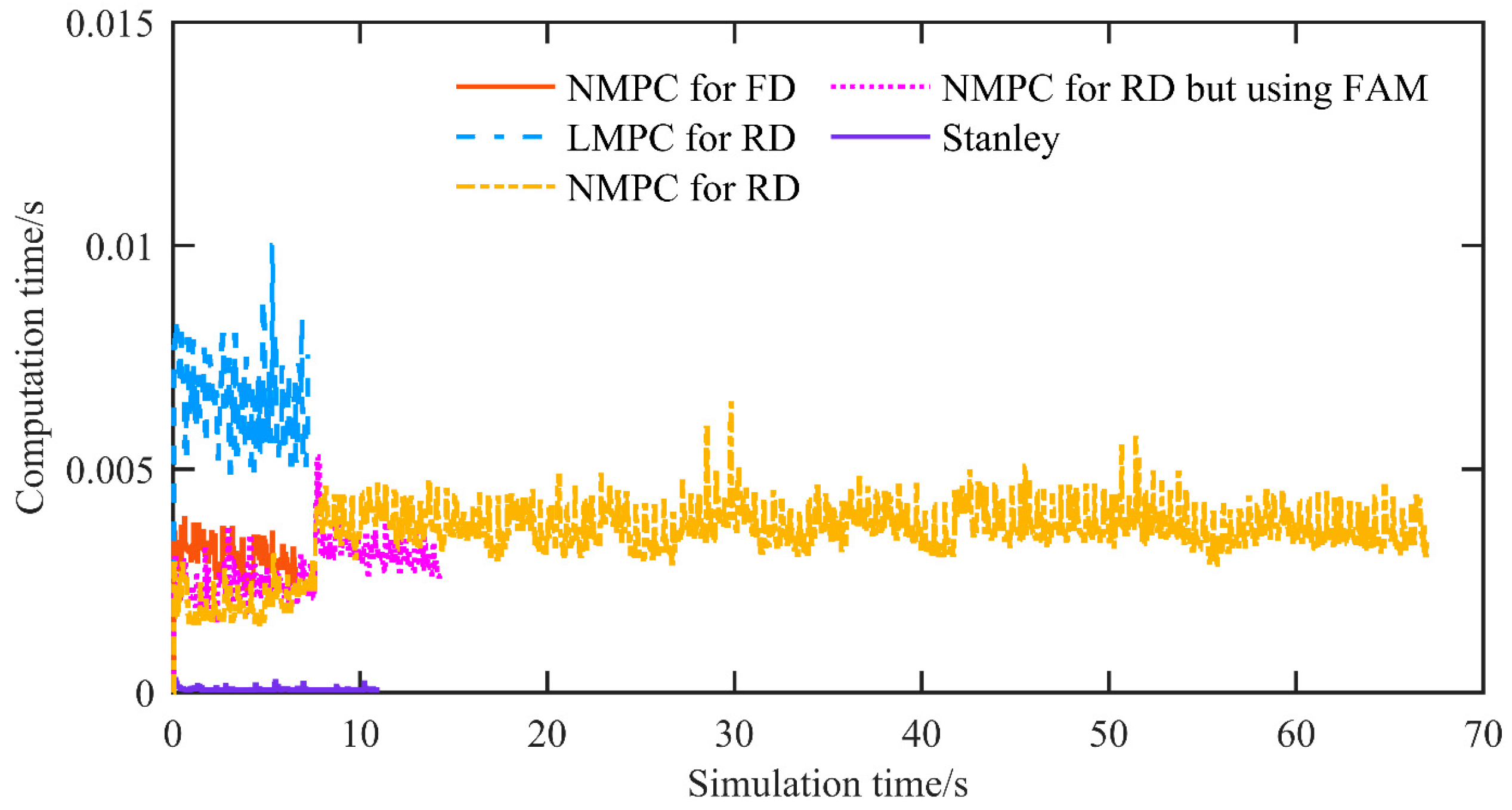 Firstly, the proposed NMPC demonstrates outstanding control accuracy and real-time performance. In terms of control accuracy, the displacement error amplitude does not exceed 0.101 m, and the heading error amplitude does not exceed 0.0372 rad. Regarding real-time performance, the maximum solution time per control period is no more than 0.007 s.