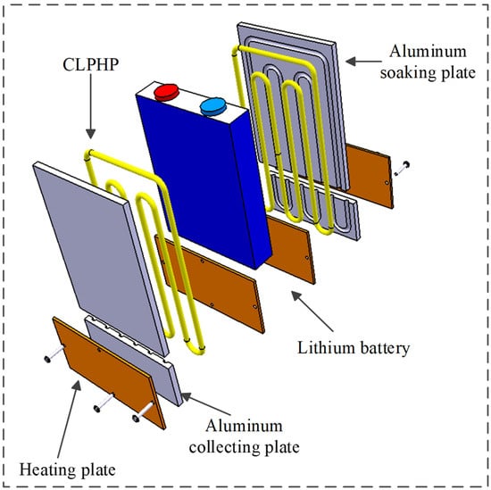 Heat pipe heating mainly refers to the transfer of heat generated by electric heating to the heat pipe. By utilizing the bidirectional thermal conductivity of the heat pipe, the condensation end is used as the battery heating end, and the heat is transferred to the heat absorption end through internal fluid motion. Its main principle lies in the advantages of high thermal conductivity, high heat flux density, flexible contact structure, and good temperature equalization effect of heat pipes [18,19], which have been widely used in the field of heat dissipation in microelectrical systems such as electronic chips for a long time. There are many current studies on the heat dissipation of lithium batteries around heat pipes [20,21,22]. He [23] proposed a thermal management system with a combination of heat pipes and liquid-cooled plates; the coverage angle of the aluminum plate on the battery had the greatest impact on the system cooling performance. When the height, thickness, coverage angle of the aluminum plate on the battery, and coverage angle of the heat pipe were greater than 50 mm, 2 mm, 75°, and 60°, respectively, it could ensure that the battery obtained a good working temperature range. And the highest temperature was 37.58 °C, with a temperature difference of 3.67 °C. Liang [24] proposed a battery thermal management with flat plate heat pipes and conducted cooling tests on a cylindrical battery at a discharge rate of 5C. The results showed that using flat plate heat pipes to cool the battery pack could limit its temperature to within 50 °C, and the temperature difference in the battery pack did not exceed 5 °C.
