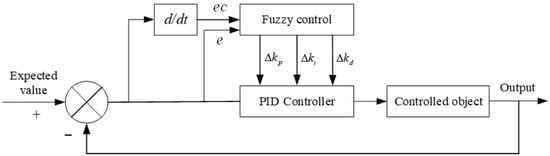 OPTMS ensures that the heating element operates throughout the entire process without the need for control. However, OECTMS requires the control of mica heating plates. Although PID control has significant advantages in industrial control, such as obvious control effects, simple system composition, and easy adjustment of control parameters [40]. However, lithium battery systems exhibit highly nonlinear time-varying characteristics, and PID control technology shows significant lag for thermal management system control. Fuzzy control, as a representative of control theory that can be implemented industrially, is suitable for dealing with complex problems such as nonlinearity, multidimensionality, and multi-field coupling [41]. Therefore, a PID controller with fuzzy control is developed for the OECTMS, as shown in Figure 2. Aim to implement thermal management strategies by controlling the power of mica heating plates.
