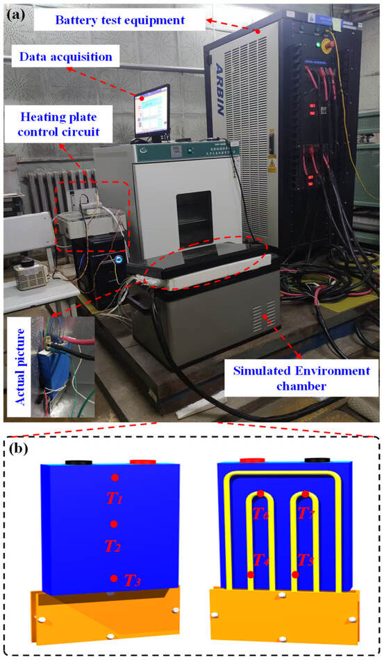 The mica heating element control circuit mainly includes three parts: information acquisition, heating control, and heating execution. The information acquisition module is responsible for recording and storing various parameters; The heating control module downloads the above thermal management strategy to the hardware control board to control its execution and sends control instructions (to control the mica heating element) to the heating execution module to achieve temperature regulation of the battery; The heating execution module includes a pulsating heat pipe, an aluminum homogenization plate, an aluminum collector plate, and mica heating plates. By adhering to the large side of the battery, the contact area between the heating execution and the large side of the battery is increased, making it easier to quickly heat the battery. During the experiment, the power of the mica heating plate was controlled by a corresponding control algorithm so that the heat generated by the heating element was transferred from the evaporation section of the pulsating heat pipe to the condensation section. The heat from the condensation section was evenly transferred to the surface of the battery through the aluminum homogenization plate. Signal acquisition utilizes temperature sensors to record temperature changes at different locations, using , , , , , and , respectively, with specific positions as shown in Figure 3b.