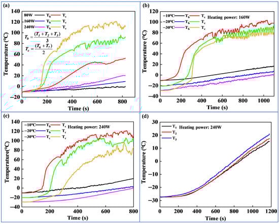 - Response of the PHP Heating System Under Preheating Conditions. Under different low-temperature conditions, a comparison of different heating powers reveals that a higher heating power results in a shorter heating time and a faster temperature rise rate of the battery. However, an excessively high heating power does not further increase the battery’s temperature rise rate; instead, it leads to a sharp increase in heating energy consumption. Selecting a heating power of 160 W can achieve an effective balance between heating time and heating energy consumption.