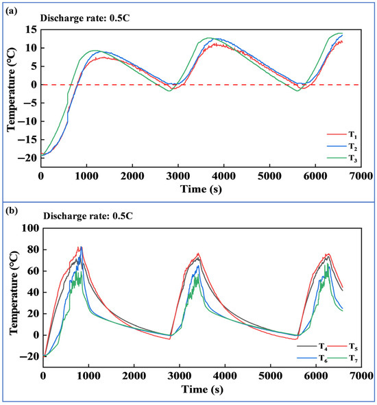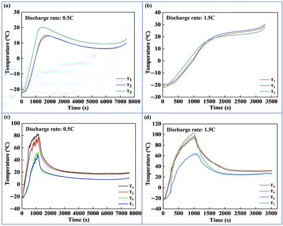 As shown in Figure 6, data on surface temperature and pulsating heat pipe temperature changes in the lithium battery with OPTMS under a low temperature of −20 °C at discharge rates of 0.5C and 1.5C were recorded. The battery temperature was always maintained above 0 °C, and the temperature changed steadily during the complete discharge process without significant temperature surges. Therefore, the pulsating heat pipe thermal management system with OPTMS continuously heats the battery, resulting in a significant increase in the surface temperature of the battery.