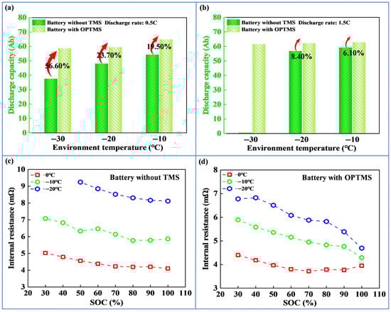 Figure 7a,b show the corresponding discharge capacity data. At a discharge rate of 0.5C, the discharge capacities of the lithium battery reached 64.83 Ah, 59.41 Ah, and 58.69 Ah, respectively. However, the capacities corresponding to the battery without TMS are 37.48 Ah, 47.99 Ah, and 54.27 Ah. Compared with a battery without TMS, the discharge capacities increased by 19.5%, 23.7%, and 56.6% in low temperatures of −10 °C, −20 °C, and −30 °C. Especially at a discharge rate of 1.5C, the battery without TMS cannot be discharged at −30 °C; the discharge capacity of the battery with OPTMS is increased to 61.55 Ah. Figure 7c shows the discharge internal resistance of the battery without TMS under different temperature conditions, while Figure 7d shows the corresponding discharge internal resistance of the battery with OPTMS. The comparison shows that the internal resistance of the battery in a low-temperature environment is the main factor that reduces battery performance. By continuously warming the battery with the OPTMS, the internal resistance of the battery decreases significantly, which improves the discharge performance of the battery to a certain extent and eliminates the adverse effects of low temperature on the battery, thereby improving the overall working environment of the battery.