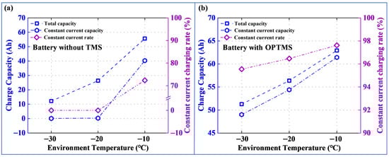 Charging capacity and constant current charging capacity rate of the battery with OPTMS. (a) battery without TMS; (b) battery with OPTMS.
