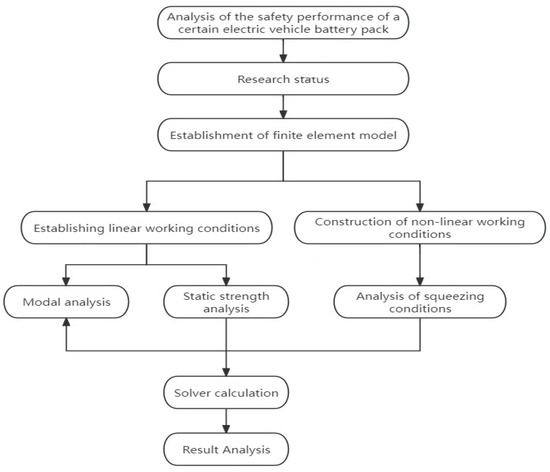 Most previous studies have focused on single or a few independent operating conditions, resulting in the lack of working condition coupling. Moreover, most studies only simulated independent operating conditions and failed to consider the scenario where “vibration-torsion-impact” multiple operating conditions act simultaneously during actual vehicle operation, which leads to a discrepancy between safety assessment and real-service environments. In actual vehicle operation, battery packs often withstand the coupled effects of multiple working conditions such as vibration, torsion, and extrusion. The analysis results under a single working condition may not be applicable to complex scenarios, which can cause insufficient safety redundancy or performance waste during real service. Based on the above limitations of existing studies, this paper, from the perspective of structural analysis and taking linear and nonlinear simulations as the research direction, constructs a multi-dimensional coupling evaluation system. It conducts stiffness, strength, and safety simulations on a power battery pack model, forming a full-scenario safety verification process covering “vibration-torsion-impact”. This not only compensates for the limitations of single-working-condition evaluation and fully explores the rationality of the model’s structural design but also provides guidance for subsequent improvements and actual production work. The technical route is shown in