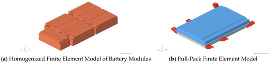 18]. The final model has a total of 393,320 nodes and 367,357 elements. The finite element models of the homogenized battery module and the entire battery pack are shown in