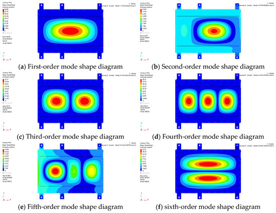 Modal shapes and natural frequencies are inherent characteristics of the structure itself, mainly determined by factors such as the structure’s own shape and material properties, and are independent of external loads. Since the battery pack structure studied belongs to the free mode, damping and external loads are not considered in the modal analysis. After simplifying Equation (1), the undamped free vibration equation obtained is shown in Equation (2).