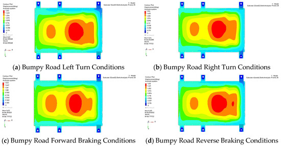 Figure 10. From the simulation results, it can be clearly observed that the deformation of the battery pack exhibits a significant characteristic of regional concentration: the deformation mainly occurs at the chamfered part of the top end of the battery pack’s upper cover, with a deformation amount of 50.14 mm. To evaluate the safety of the battery pack’s internal structure, the relative positional relationship between the battery module and the case was measured. The results show that the distance between the head of the battery module and the edge of the case is 90 mm; therefore, the case does not come into direct contact with the internal battery module, which effectively avoids safety risks caused by collisions between the module and the case, indicating excellent safety performance of the battery pack.