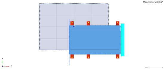 23], a semi-cylinder with a radius of 75 mm is used as the extrusion plate in the test, and the length of the extrusion plate must be greater than the height of the battery pack under test. The extrusion process shall be carried out along two directions (X and Y), which, respectively, represent the frontal impact that may occur when the vehicle is moving forward and the collision force from the side: the X direction corresponds to the vehicle’s running direction, while the Y direction is the horizontal direction perpendicular to the vehicle’s forward direction. The test termination conditions are the extrusion force reaches 100 kN, or the extrusion deformation reaches 30% of the overall dimension in the extrusion direction. After reaching either condition, this state shall be maintained for 10 min, followed by a 1 h observation period; during the entire process, the battery pack is required to have no phenomena such as ignition or explosion. The finite element model for extrusion in the X direction is shown in