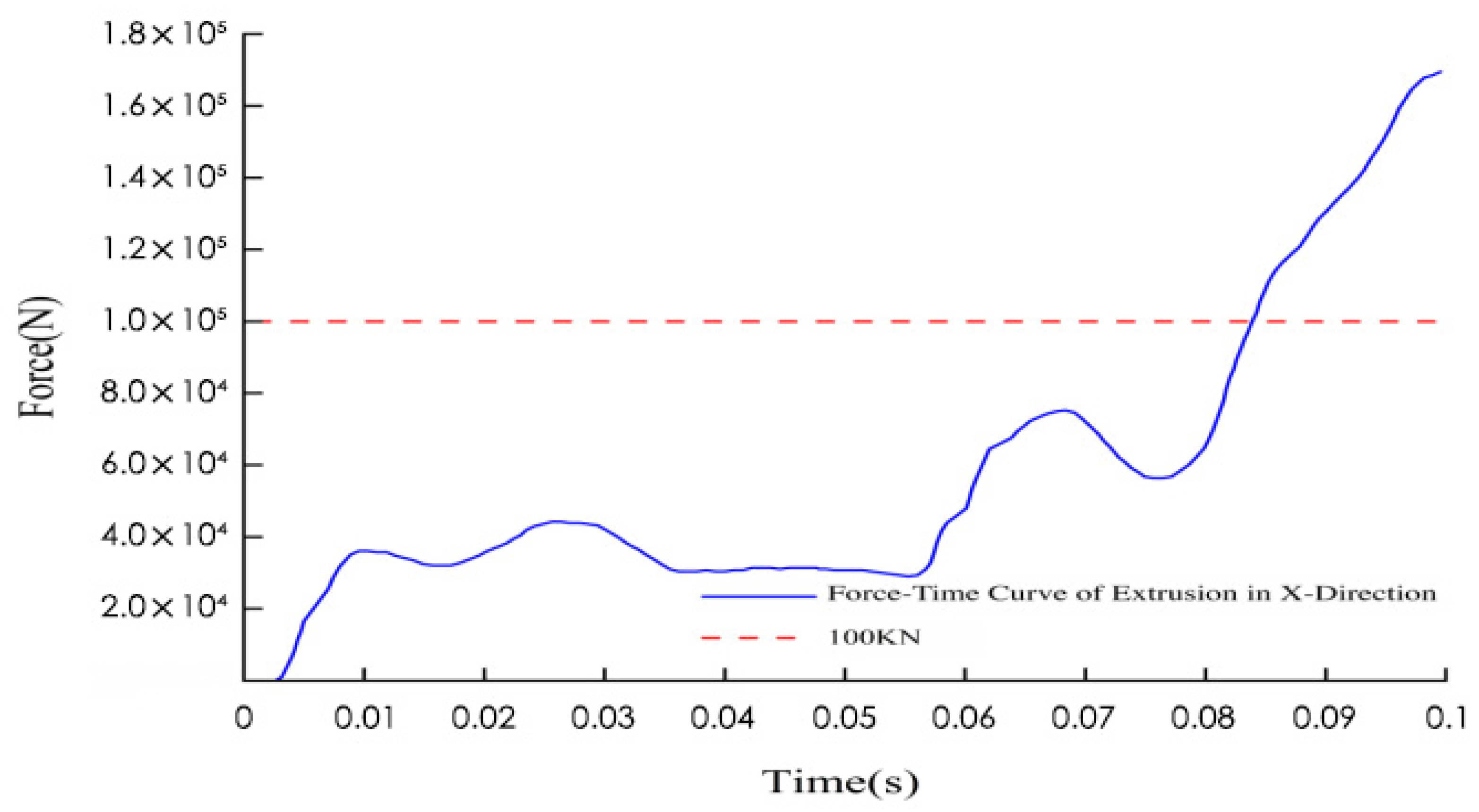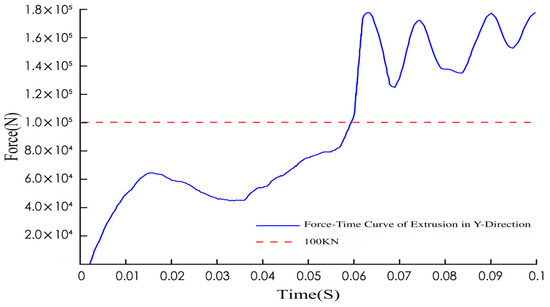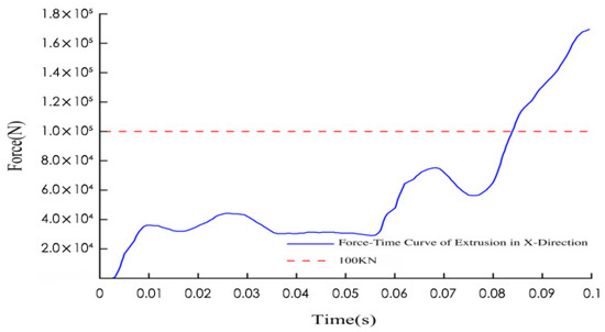After the k-file was established and solved in HyperMesh, it was imported into the LS-DYNA solver for calculation. The force-time curve of the semi-cylinder under the X-direction extrusion condition obtained from the calculation is shown in
