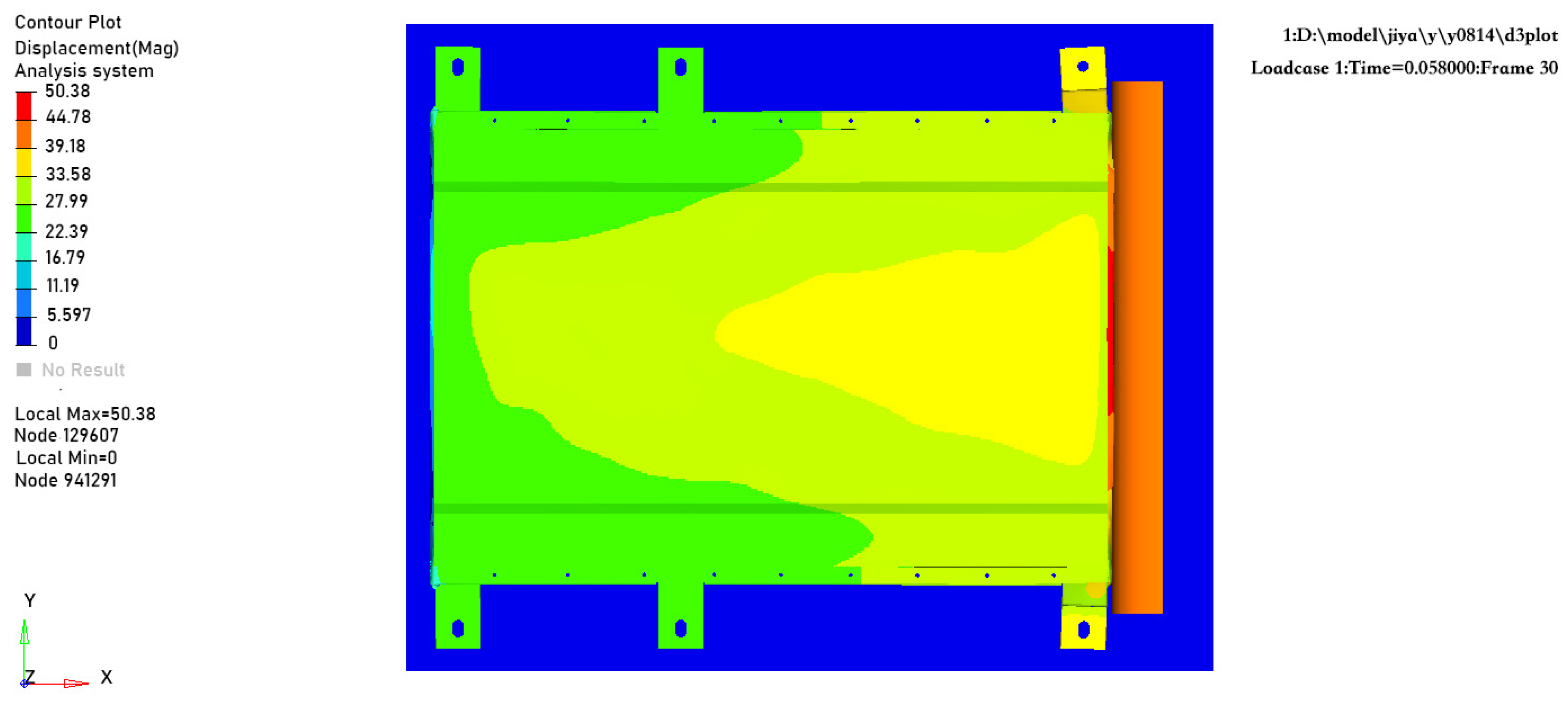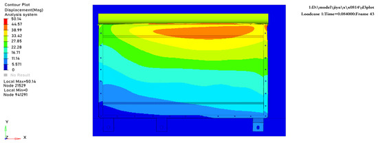 Figure 12. The deformation of the battery pack is mainly concentrated at the contact area between the semi-cylindrical extrusion plate and the side wall of the lower case, with a deformation amount of 50.38 mm. Measurements indicate that the distance between the side of the battery module and the edge of the case is 99 mm; therefore, the case does not come into direct contact with the battery module, demonstrating good safety performance.