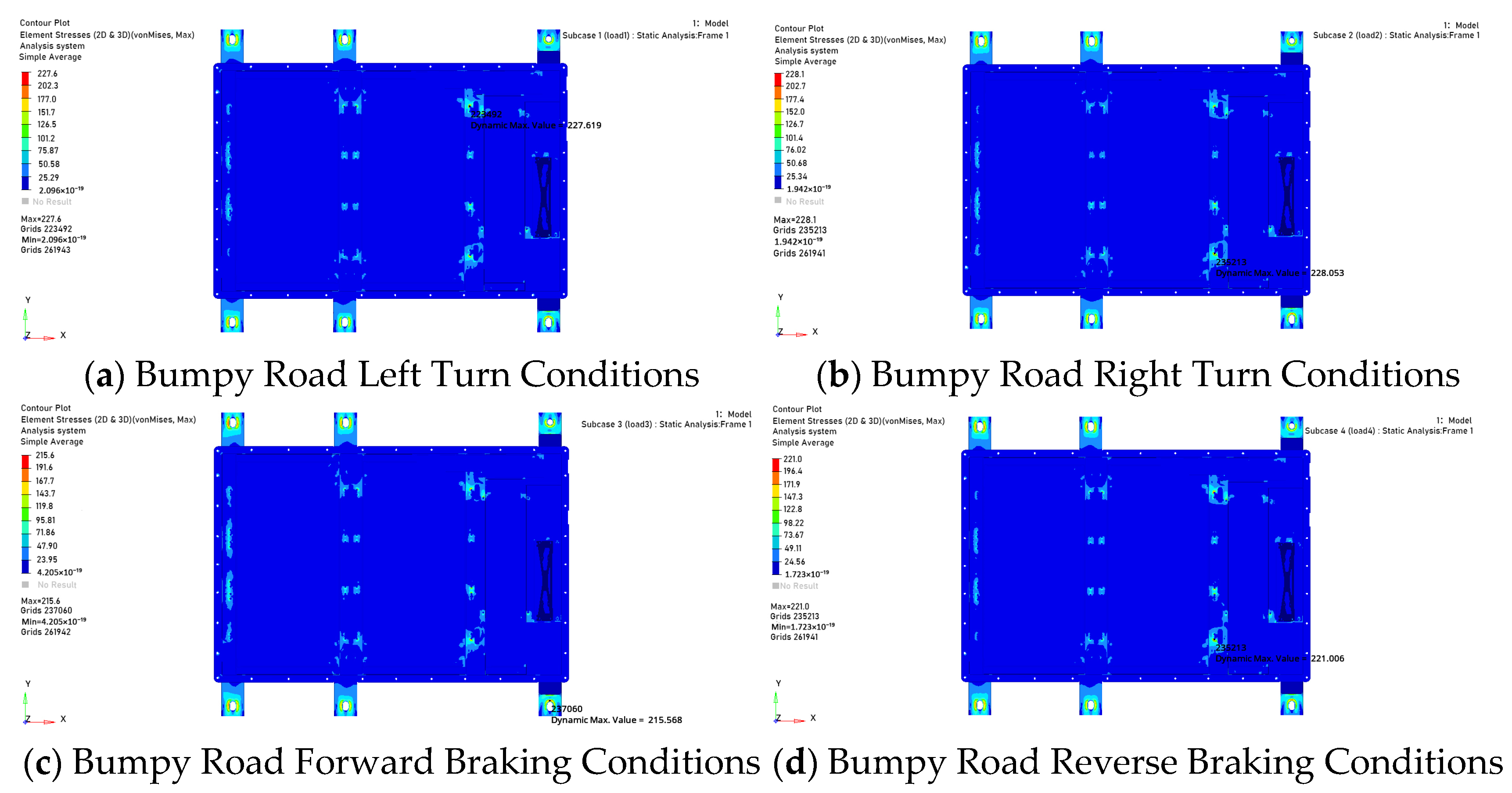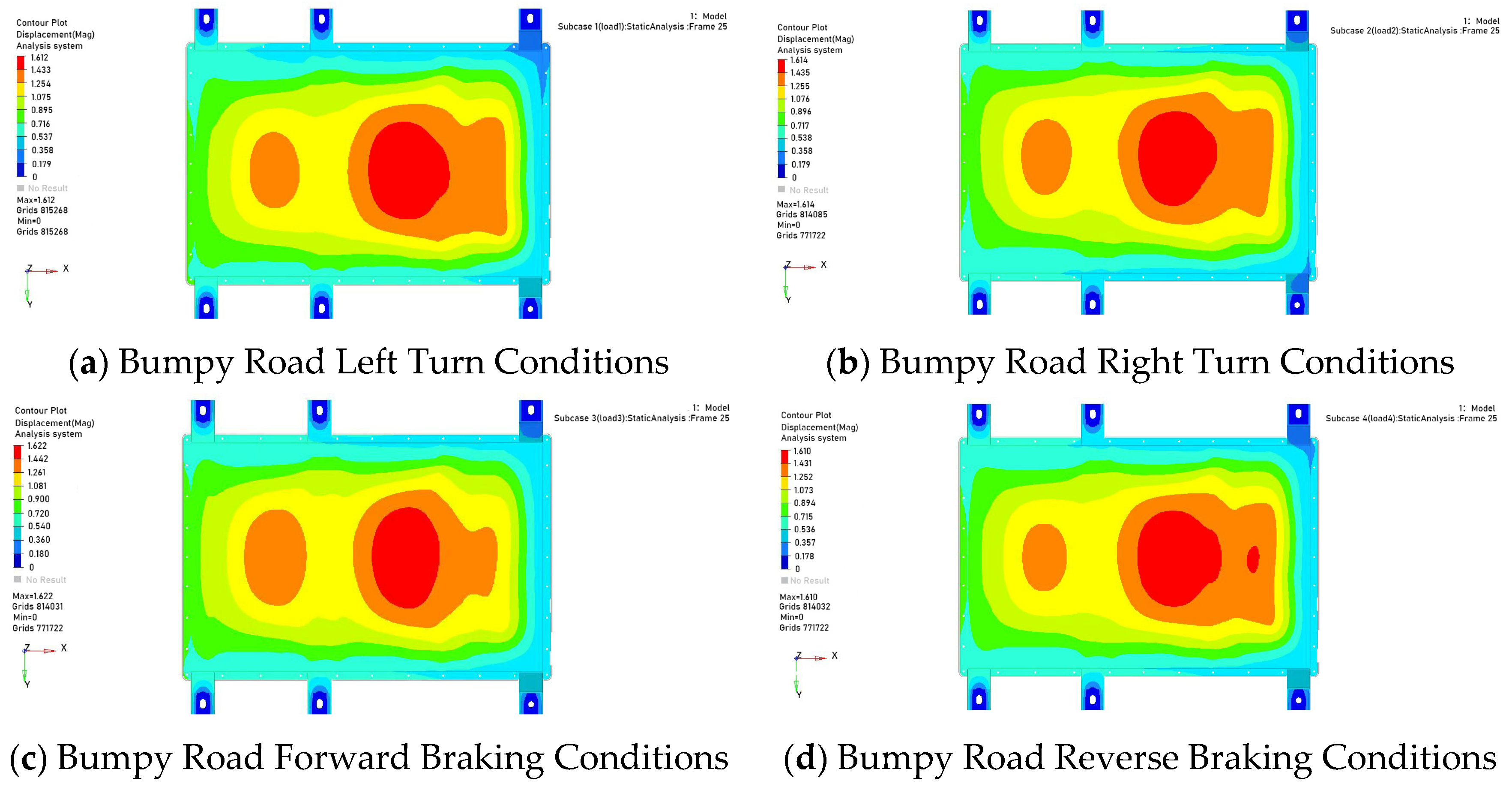 In the modal characteristic analysis, the vibration characteristics were solved using the finite element model of the battery pack. The first-order natural frequency was found to be 23.16 Hz, and the mode shape showed that the maximum amplitude was 36.85 mm, located in the middle of the upper cover. This indicates that the excitation frequency of road unevenness may resonate with the natural frequency of the battery pack, posing a potential risk of structural damage. To verify the structural reliability under static loads, simulations were conducted for 4 typical static working conditions. The results showed that the maximum stress was 228.1 MPa, which is less than the material yield limit; the maximum displacement was 1.622 mm, within the allowable deformation range. Additionally, the safety factors of key parts such as the lower case support structure and the top cover connection area were all greater than 1, indicating that the static strength meets the design and application requirements. The extrusion working condition simulation was carried out in accordance with GB/T 38031-2025, simulating lateral and forward extrusion scenarios. The results showed that the maximum deformation in the X-direction was 35.20 mm, and that in the Y-direction was 26.10 mm. Both values are less than the reserved safety distance between the internal modules and the edge of the case. No contact or extrusion between the modules and the case occurred, demonstrating that the battery pack can effectively protect the cells and its safety performance meets the collision safety standards.