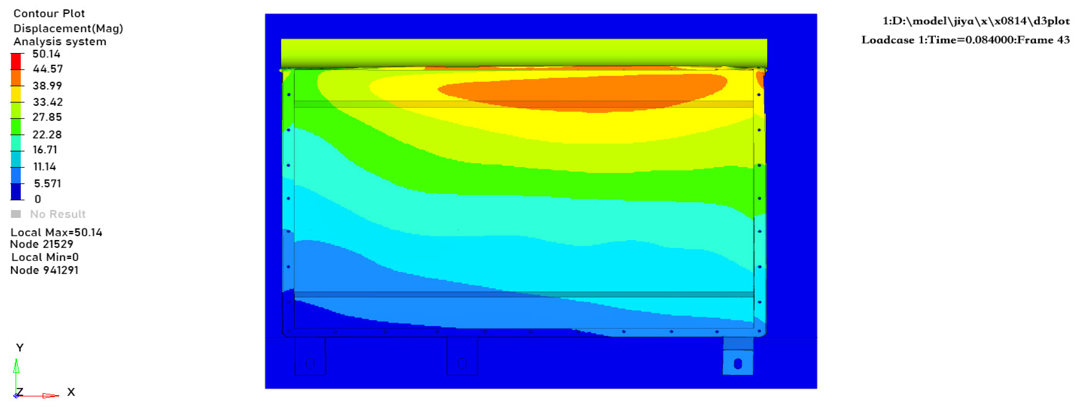 In summary, the first natural frequency of the battery pack is 23.16 Hz, which is lower than the excitation frequency of the road surface at 27.8 Hz. This indicates that the excitation frequency caused by road unevenness is likely to resonate with the first natural frequency of the battery pack Combining with the natural frequency modal diagram, it can be seen that the excitation point is located in the middle of the upper cover, indicating insufficient stiffness at this location.