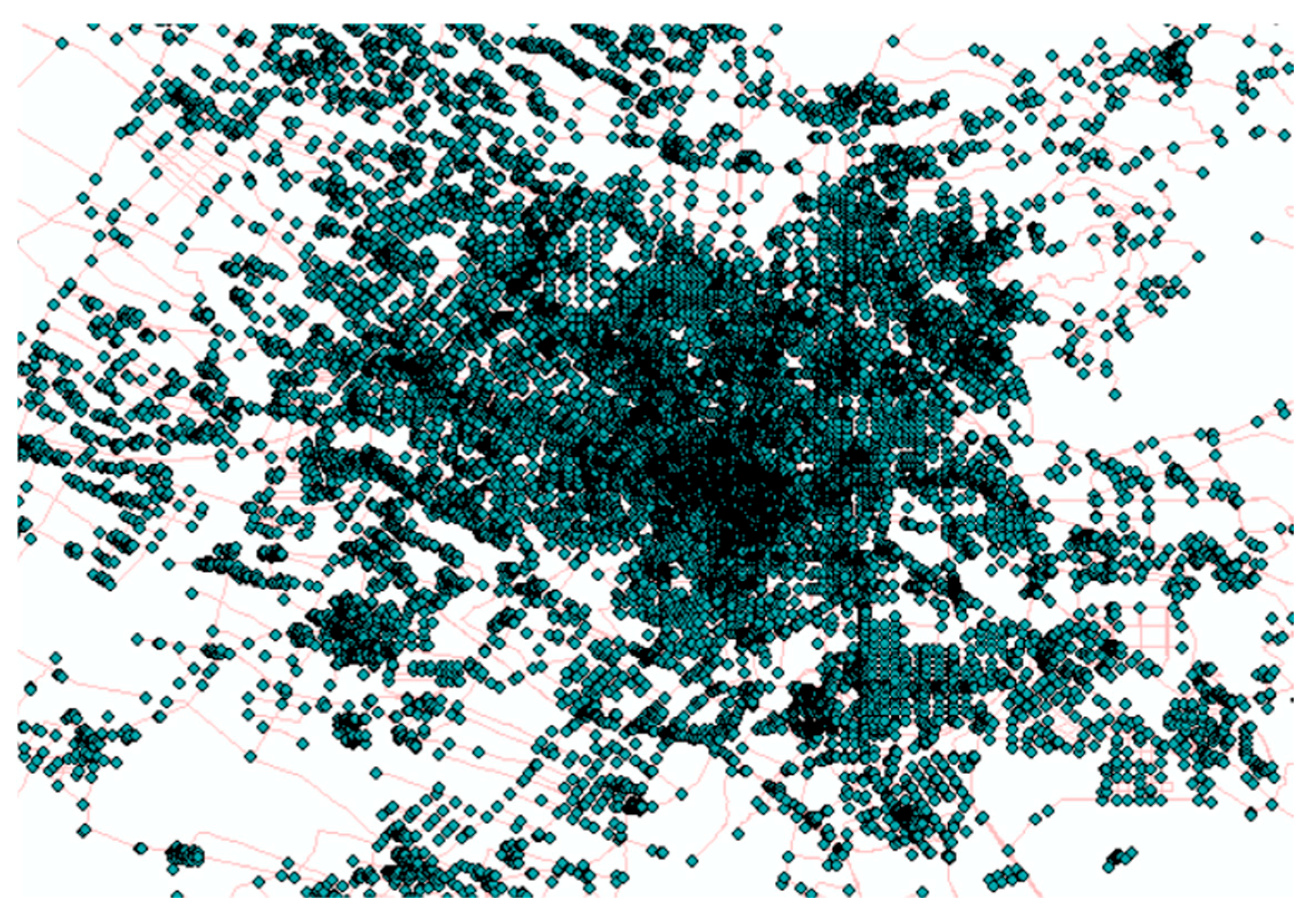 - The actual traffic road network of the study area is abstracted into a network topology using ArcGIS software (https://www.arcgis.com/index.html), and the charging demand points within the study area are topologically processed to facilitate the site selection analysis and optimization of charging stations [17].