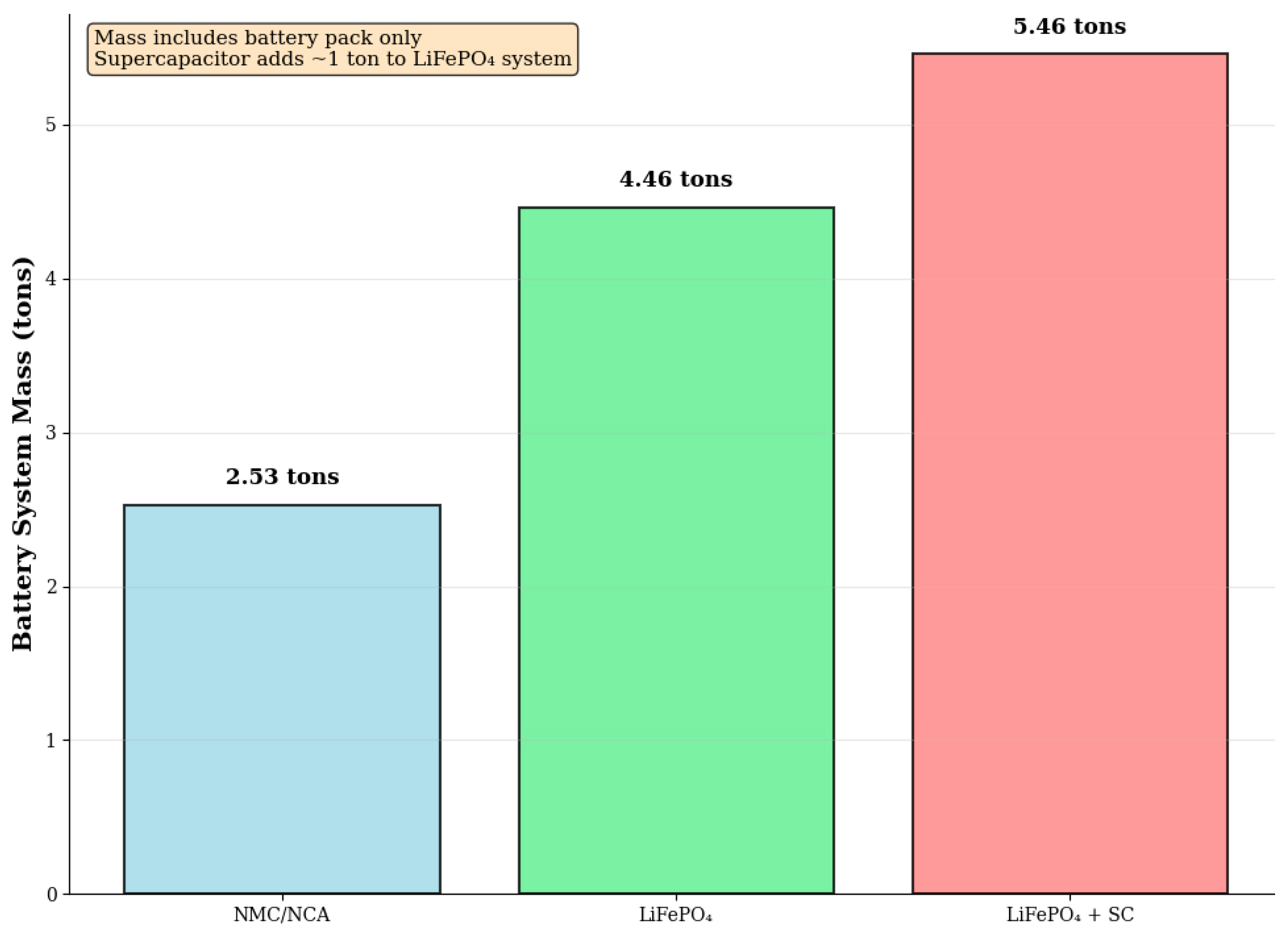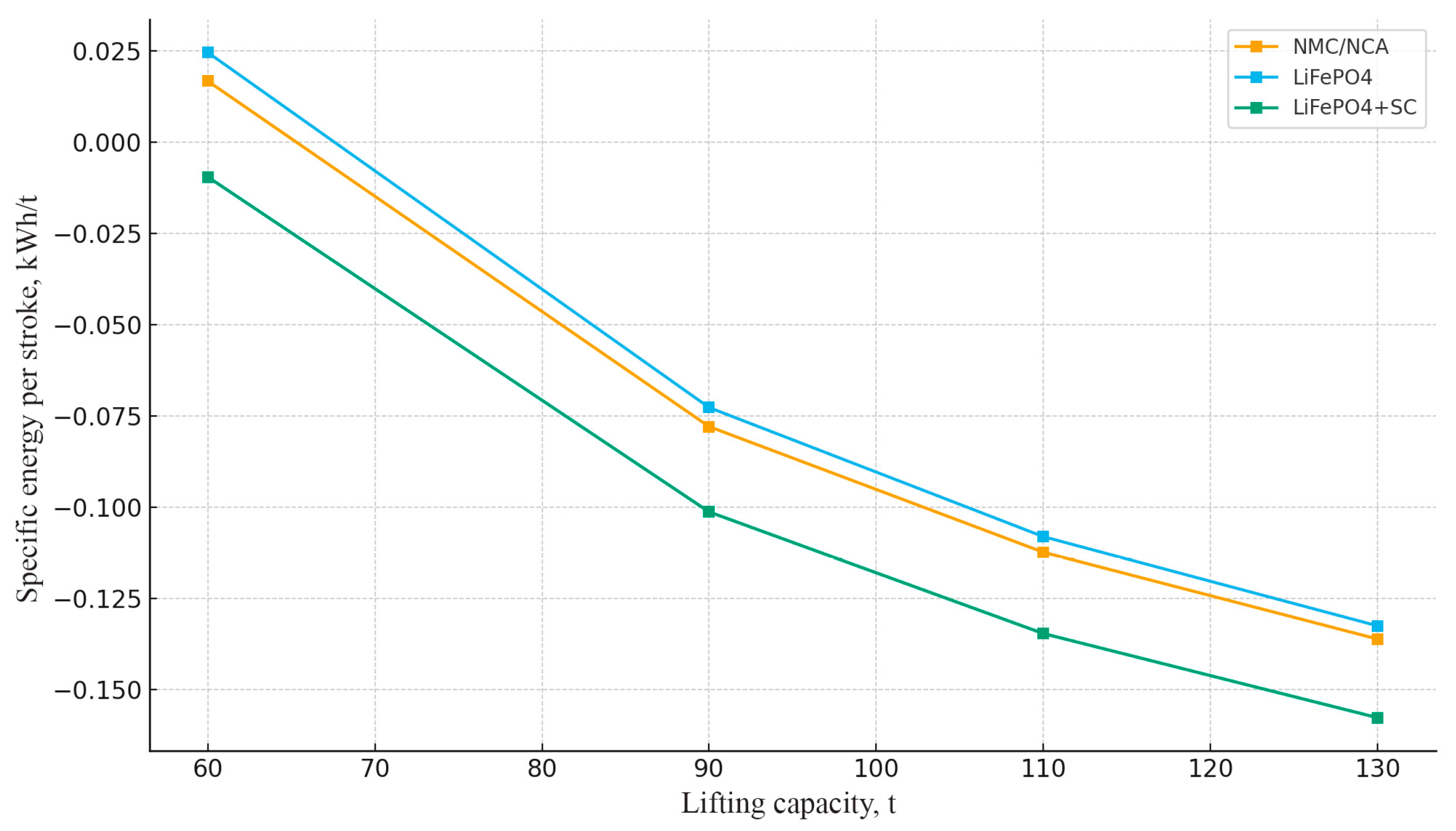 The hybrid LFP system + supercapacitors showed the best results in terms of specific power consumption (kWh/t) for high loads. Supercapacitors effectively solve the key problem of recuperation, i.e., the reception of large surge currents, which reduces the degradation of LFP batteries and increases the overall efficiency of the system. This makes this configuration the most technologically advanced and future-proof solution for this application.