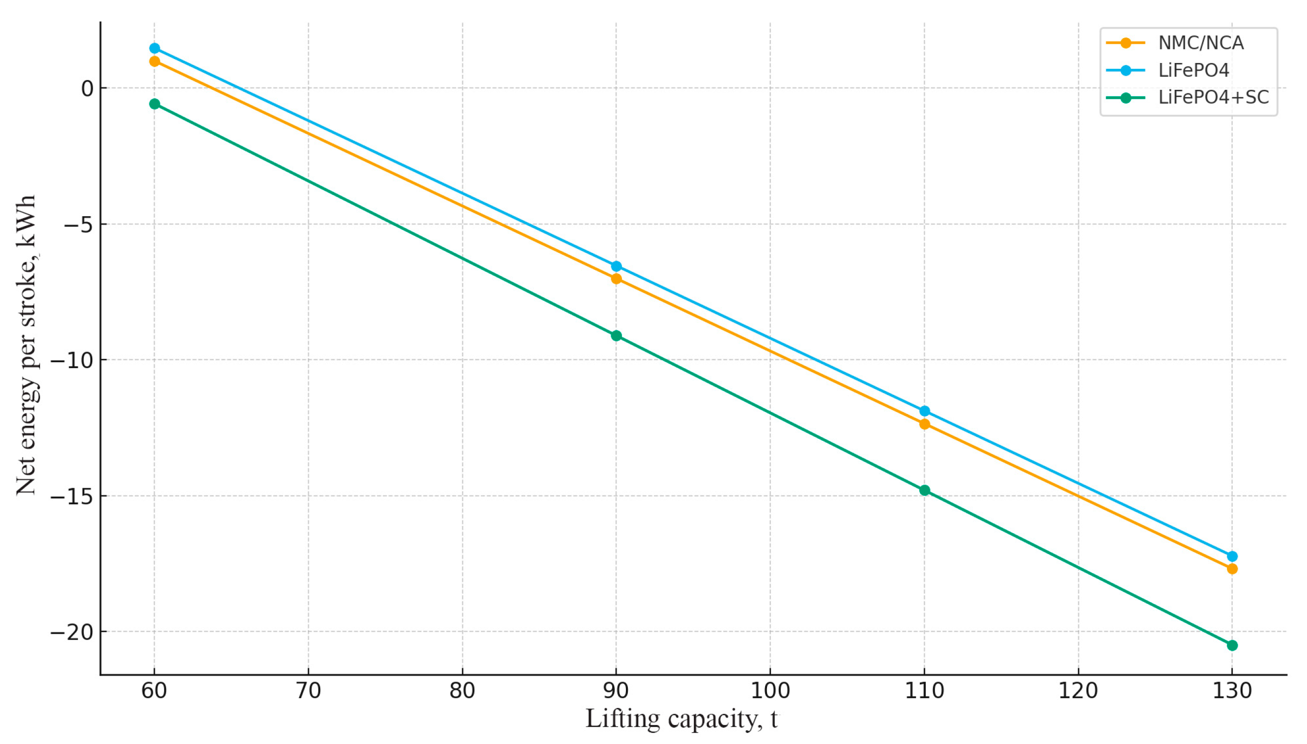 As can be seen from the figure, with a lifting capacity of more than 110 tons, all energy storage systems under consideration demonstrate negative net consumption, which indicates energy generation during the cycle. This effect is due to the predominance of regenerative braking energy during the descent over the energy spent on lifting the empty dump truck and moving along horizontal sections. The hybrid LiFePO4 + SC system shows the best results due to the ability of supercapacitors to effectively absorb high-power pulses of regenerative energy.