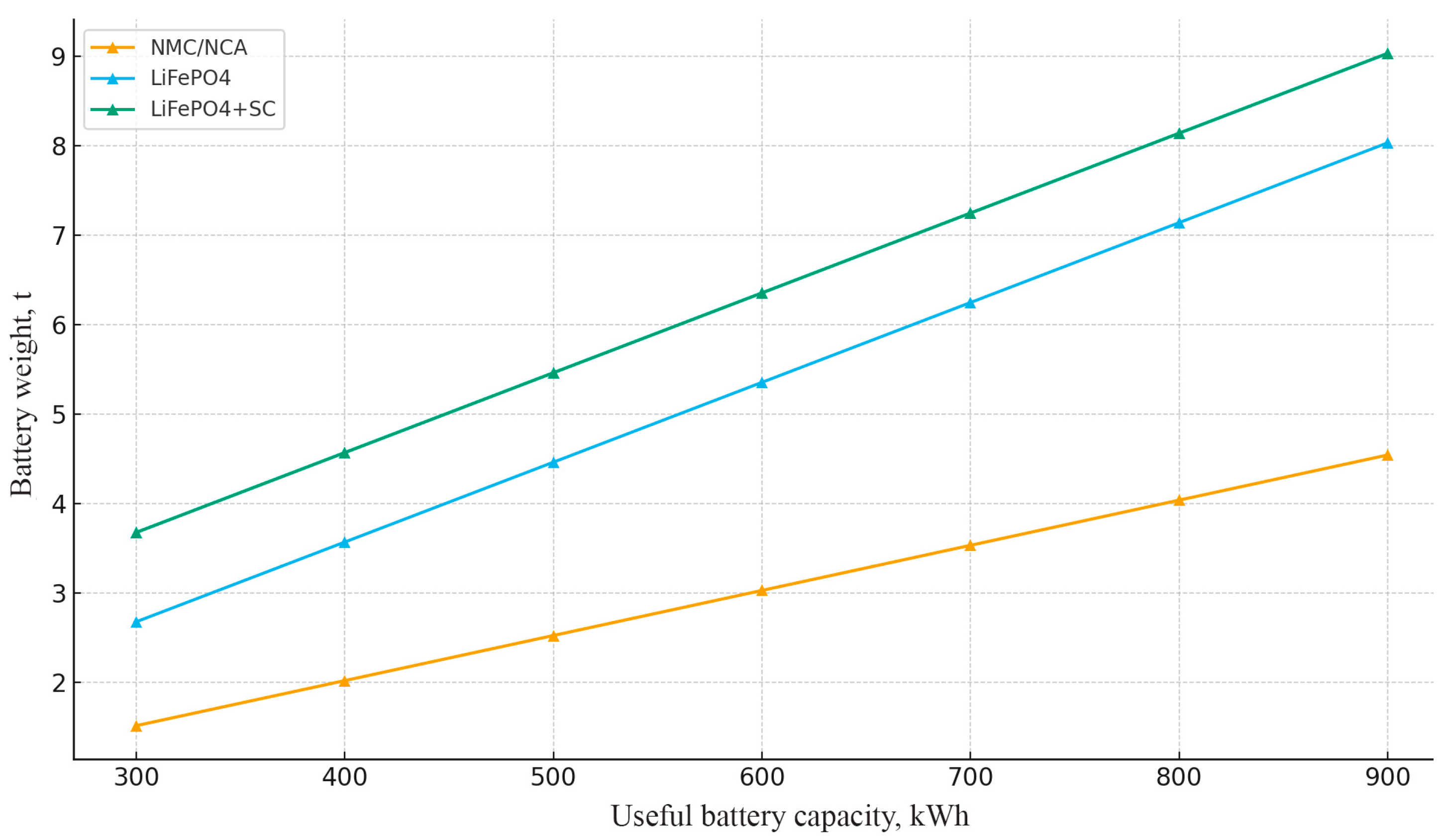 - Comparative analysis of different types of energy storage devices (NMC/NCA, LiFePO4 batteries, and hybrid LiFePO4 system + supercapacitors) according to the criteria of energy efficiency, reliability, and suitability for harsh operating conditions.