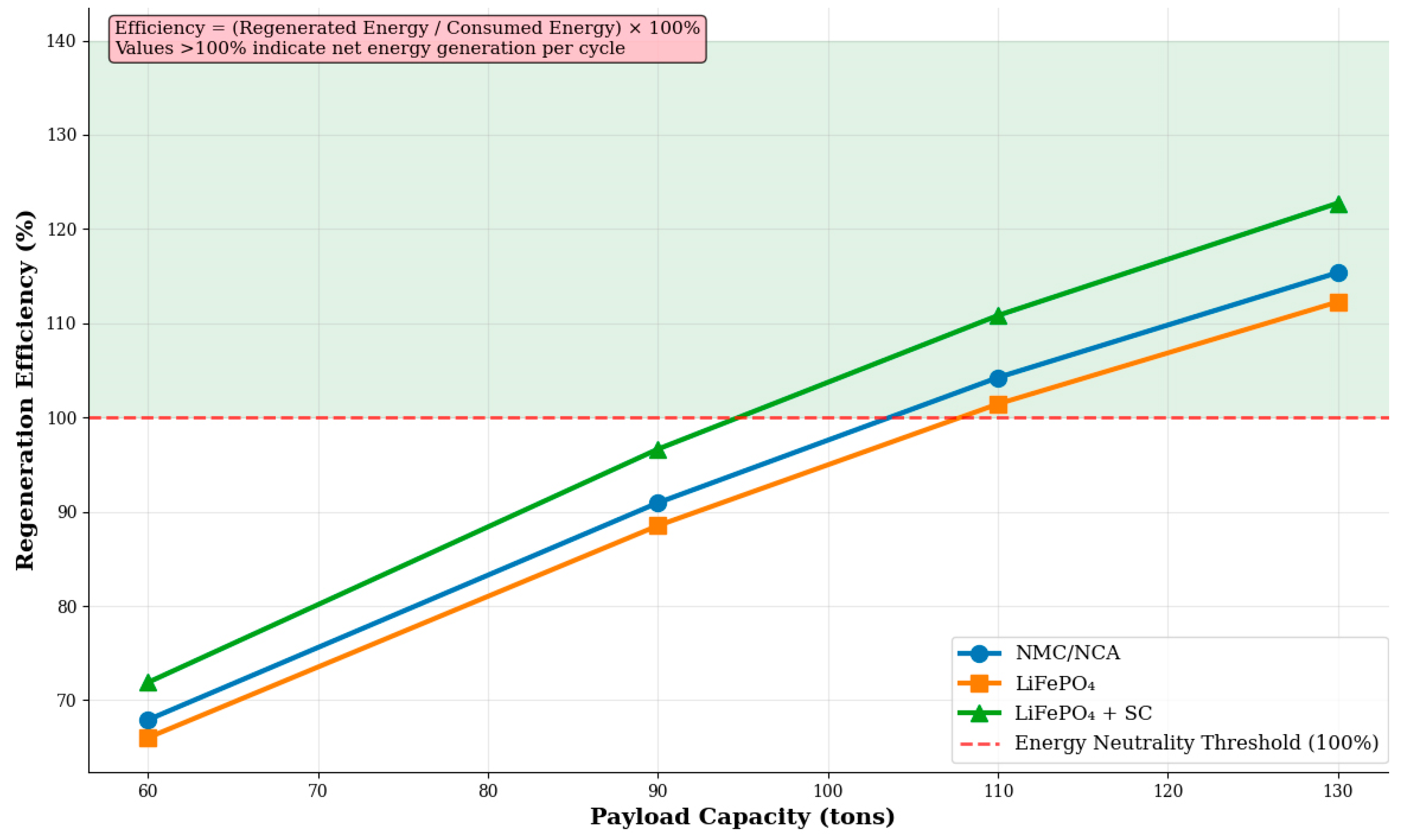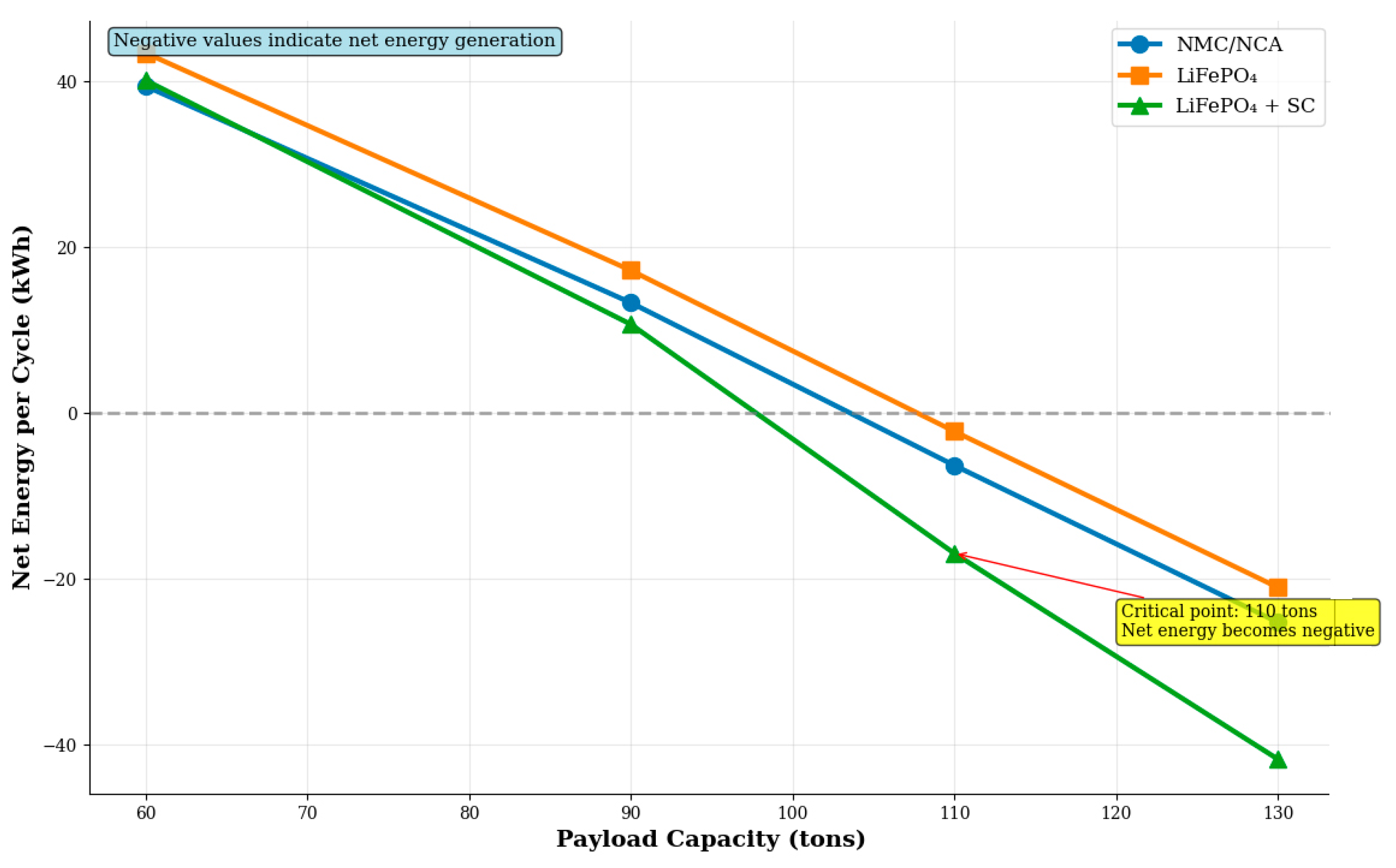 The modeled transition near ~110 t is not universal. Lower average speed reduces back-EMF and available regen power; shorter descent segments reduce harvest time; colder ambient conditions increase viscous and rolling losses and may tighten battery acceptance windows. Under such conditions, the payload required for net generation increases, and fleets may instead target near-neutral cycles. We explicitly note that hybrid LFP+SC mitigates power-acceptance limits during high-power braking but cannot overcome kinematic limits at very low speed or very short descents.