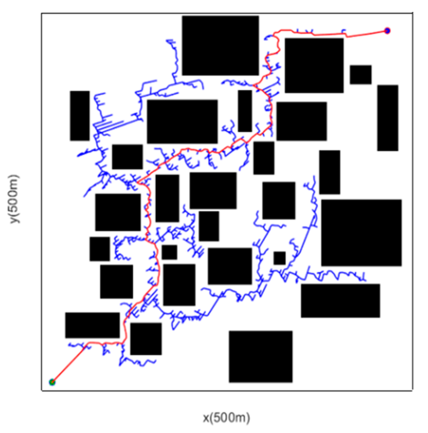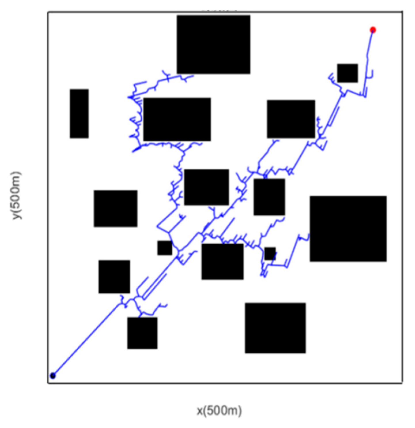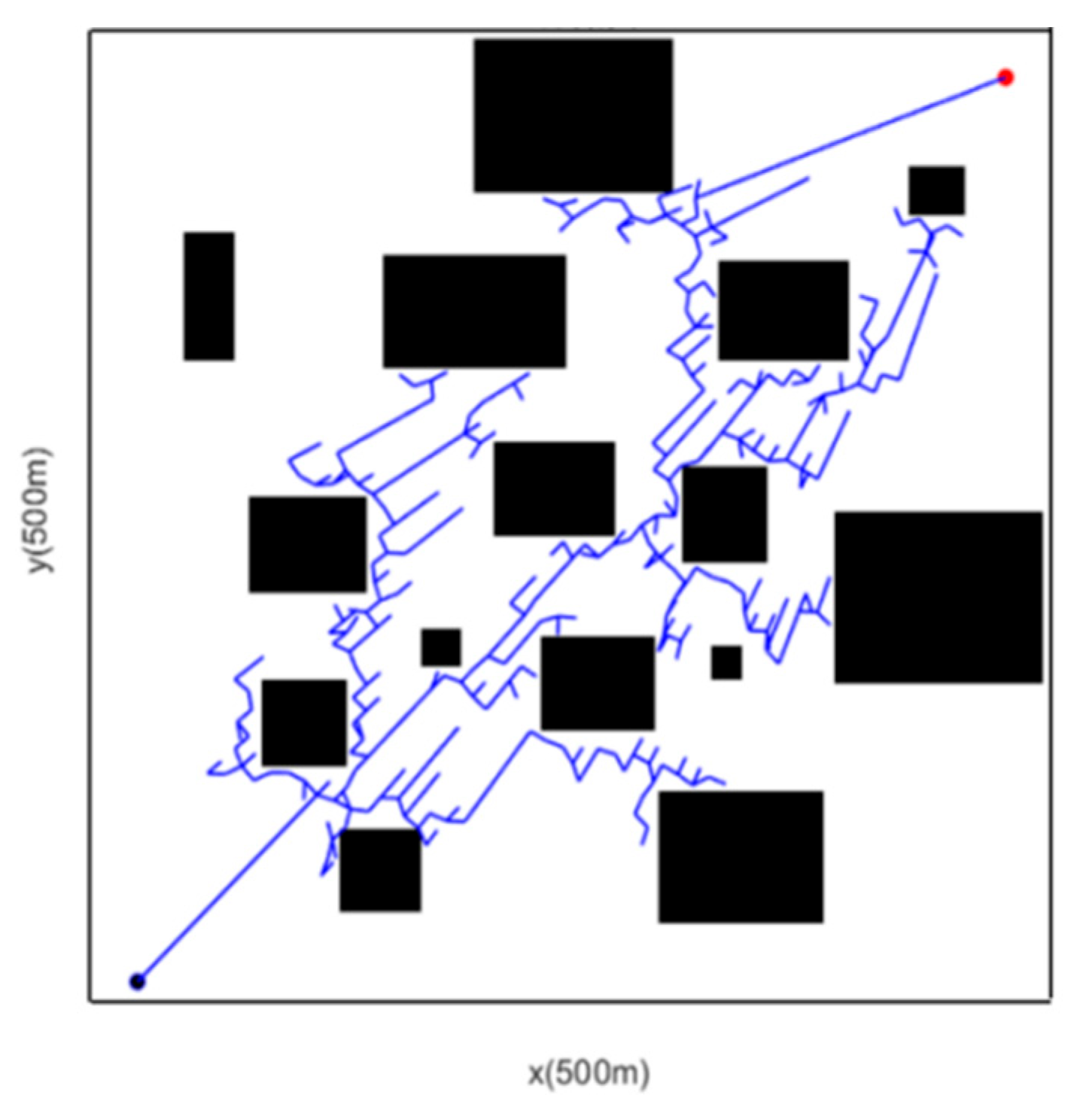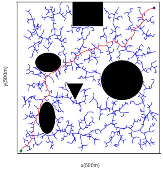 From the perspective of a simplified map, this study selects a rectangular grid map as the experimental map environment, with a resolution of 1 m × 1 m. To verify the proposed multi-modified RRT algorithm, 20 simulation experiments were conducted respectively in simple and complex scenarios using MATLAB as the simulation tool, within a 500 m × 500 m grid scenario map. Additionally, due to the random sampling characteristic of the RRT algorithm during path searching, the path results are not unique; thus, one of the path planning results is selected as the simulation result for comparison in this study.