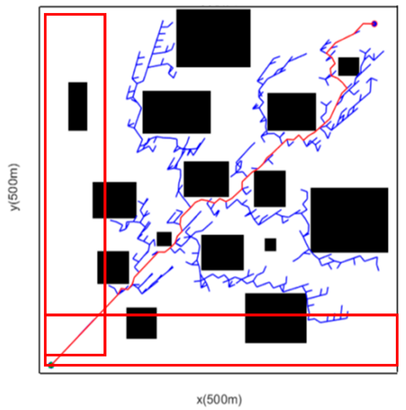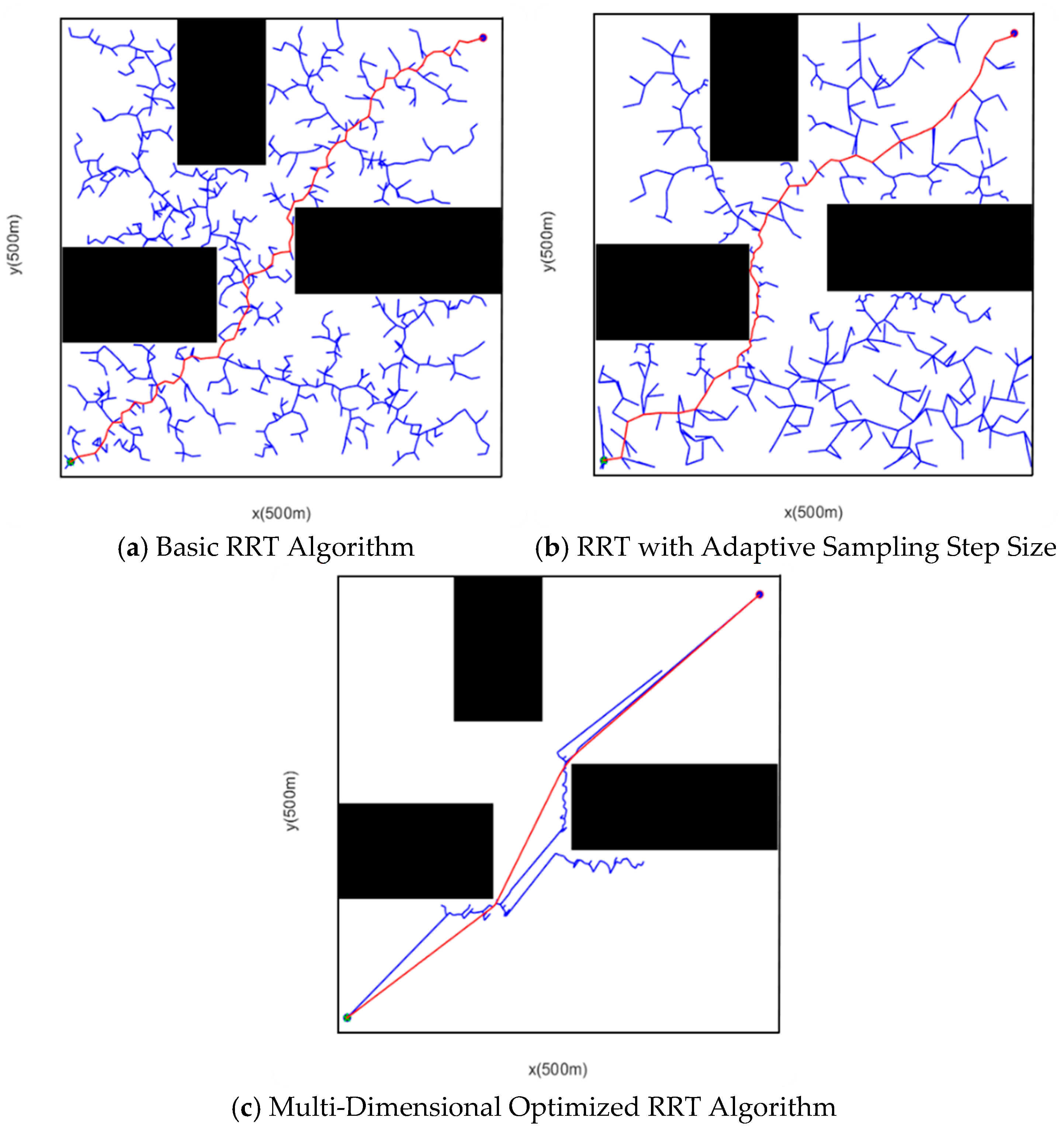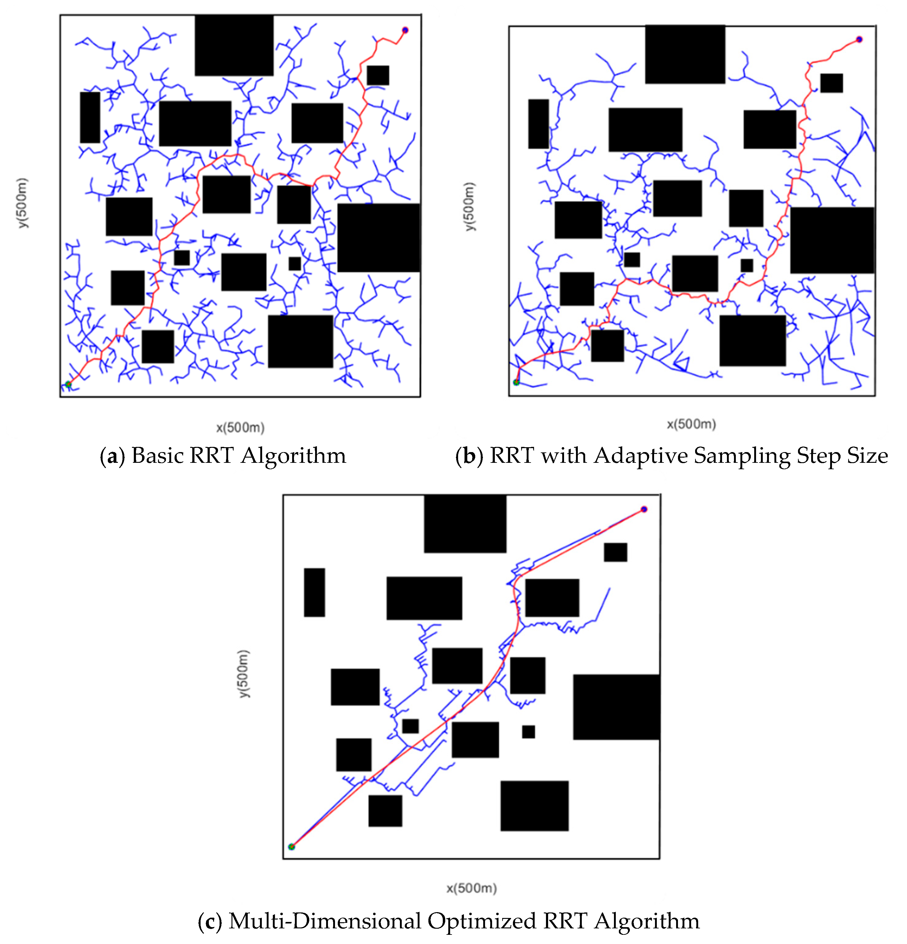 From the perspective of a simplified map, this study selects a rectangular grid map as the experimental map environment, with a resolution of 1 m × 1 m. To verify the proposed multi-modified RRT algorithm, 20 simulation experiments were conducted respectively in simple and complex scenarios using MATLAB as the simulation tool, within a 500 m × 500 m grid scenario map. Additionally, due to the random sampling characteristic of the RRT algorithm during path searching, the path results are not unique; thus, one of the path planning results is selected as the simulation result for comparison in this study.