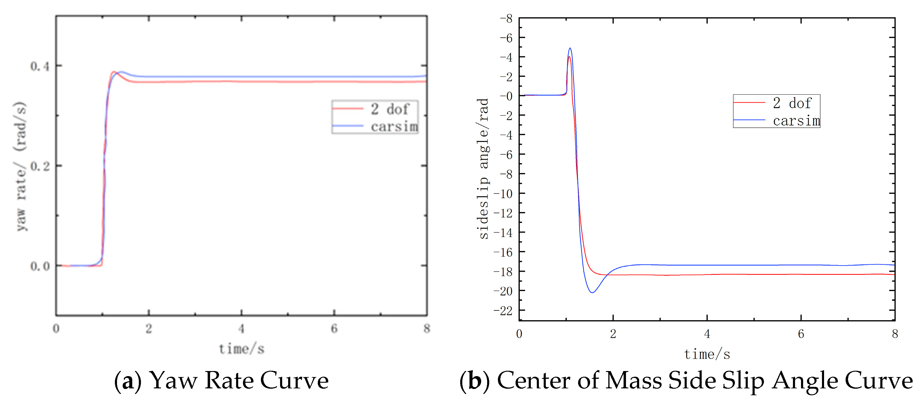 To ensure the stability and rationality of the path presented in subsequent sections, the accuracy of the established 2-degree-of-freedom (2-DOF) vehicle dynamics model was verified and analyzed. Under the operating condition of a front-wheel angle input in the form of a step signal with a wheel angle of 0.09 rad at a speed of 80 km/h, the comparison curves of parameter responses between the 2-DOF model and the CarSim vehicle are shown in Figure 2.