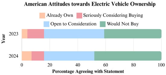 American attitudes towards EV ownership—a summarized breakdown of customers who own, would like to own, and who would not like to own an EV based on available literature [10]. The figure illustrates an increase in the percentage of Americans who would not consider purchasing an electric vehicle between 2023 and 2024.