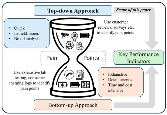 The perception of unreliable public chargers has garnered significant attention in both automotive circles and mainstream media outlets [20]. Consequently, as shown in Figure 2, EV charging stakeholders have adopted a two-pronged approach to address this problem. Method 1 involves a bottom-up approach, where extensive lab testing is undertaken and actual EV charging logs are analyzed to identify the root causes of problems [21,22]. While this method is systematic and approach-driven, it is often time-consuming due to the sheer volume of logs and various challenges, such as data privacy issues, amongst other interoperability concerns. On the other hand, Method 2 employs a data-driven top-down approach, leveraging customer reviews to obtain quick, first-hand information about in-field problems [23,24,25,26]. While this approach may oversimplify the issues at hand, it facilitates a rapid assessment of the current issues and the overall state of the EV customer experience. Such customer reviews have been extensively cited in media articles, exemplified by accounts like those described by Malarkey et al. [16]. Reports from reputable sources like Motor Trend further illuminate staff members’ experiences with EV charging during winter road trips, exposing frustrations with inadequate and unreliable charging infrastructure [27,28]. Additionally, recent efforts by well-established entities, such as JD Power, focus on assessing the general EV customer experience, finding that these frustrations are common across the EV landscape [29].