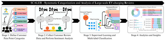 In this work, we propose a comprehensive four-stage process to tackle the aforementioned challenges, titled SCALER (Systematic Categorization and Analysis of Large-scale EV-charging Reviews). SCALER is illustrated in Figure 3. The first stage of SCALER focuses on defining the charging experience and categorizing common issues into distinct CPP categories, leveraging insights from over 85 stakeholders in the ChargeX Consortium. This establishes a foundational framework for categorizing the diverse issues customers face during EV charging. The second stage involves the systematic collection and filtering of customer reviews from various public platforms. During this stage, we employ sentiment analysis to filter out reviews, focusing particularly on those that are negative, which are more likely to contain valuable information about problems with the EV charging infrastructure. In the third stage, the filtered reviews are then classified into the predefined CPP categories using a supervised learning algorithm. This ensures that each review is accurately categorized, allowing for a structured analysis of the issues identified by EV customers. The final stage involves an in-depth analysis of the categorized review data. By examining the binned data, we can extract valuable insights into the state of EV charging infrastructure and highlight the most pressing pain points and areas needing improvement. More details on each stage of SCALER are provided in the following sections.