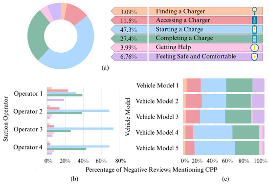 Insights into the distribution of CPPs in our dataset by (a) category, (b) station operator, and (c) vehicle model. “Starting a Charge” dominates across the overall dataset, with nearly half of all negative reviews mentioning this CPP. From plots (b,c), notable variance in CPP distribution can be observed from different station operators and vehicles.