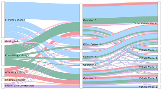 Sankey diagram showing the relationship between each CPP category (leftmost stage) to individual station operators (center stage) and vehicle models (rightmost stage). The size of each bar represents the number of reviews belonging to the relevant classifier. Operators 1 and 2 make up most of the dataset, with roughly two-thirds of reviews being left at stations owned by these CSOs. The distribution of vehicle models is more diverse, though the five most popular EVs accounted for nearly half of all reviews.