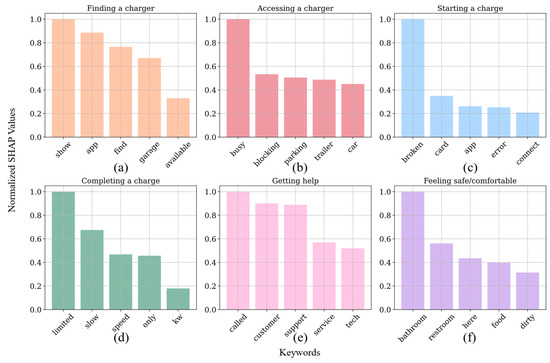 Figure 9 provides a SHapley Additive exPlanations (SHAP) analysis detailing the top five keywords for each CPP category, offering insights into customer mentality and the specific challenges EV charging customers encounter [37]. For the category of Finding a Charger, keywords, such as ‘show,’ ‘app,’ ‘find,’ ‘garage,’ and ‘available’ indicate prevalent issues with finding a charger that may be in garages, along with misleading availabilities. For Accessing a Charger, terms such as ‘busy’ and ‘blocking’ indicated issues with charger availability, and terms such as ‘parking’ and ‘trailer’ hint at issues with charger access and inability to charge with trailers, suggesting a need for better charging station layout and management. A keyword that dominated over others in reviews within the category Starting a Charge was the word ‘broken’. This indicates that customers may have attributed the inability to start a charge to broken hardware. The presence of keywords ‘app,’ and ‘connect’ also indicates frequent issues with problematic physical or communications connections and smartphone applications that were required to start a charge. In Completing a Charge, the keywords ‘limited,’ ‘slow,’ ‘speed,’ and ‘kw’ reflected issues with power delivery and slower-than-expected charging progress. Getting Help was characterized by the keywords, ‘called’, ‘customer,’ ‘support,’ ‘service,’ and ‘tech,’ indicating frustrations with customer service that could benefit from more efficient support processes. The Feeling Safe/Comfortable category featured words, such as ‘bathroom,’ ‘restroom,’ ‘food,’ and ‘dirty’ pointing to dissatisfaction with local facilities and services. These insights highlight specific areas where EV charging stakeholders can target improvements to enhance customer satisfaction.