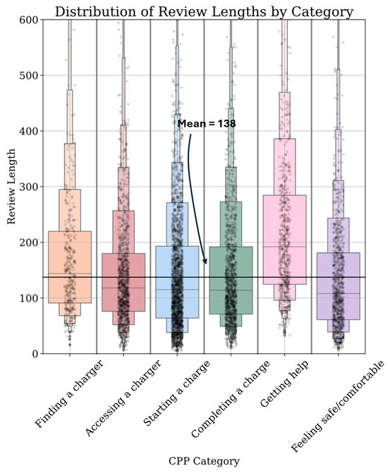 Finally, to delve deeper into the thought processes of customers, we examined the relationship between the lengths of reviews and CPP categories. This analysis, summarized in Table 7 and depicted in Figure 10, provides insights into the verbosity with which customers discuss issues related to EV charging. From the data presented, it is evident that review lengths vary significantly across different CPP categories. Notably, Getting Help records the longest average comment length at 230 words, with a correlation coefficient of 0.316, indicating that customers tended to provide more detailed descriptions when they encountered customer-service-related challenges. Conversely, reviews in the Feeling Safe/Comfortable category are typically shorter, averaging 139 words, meaning that safety and comfort concerns were usually expressed more succinctly. The other categories exhibit similar lengths, reflecting a moderate level of detail in customer feedback. Although these metrics may be valuable to understand how customers prioritize and articulate different types of pain points, due to the absence of strong correlations, more research is needed to truly understand the relationship between review lengths and CPPs.