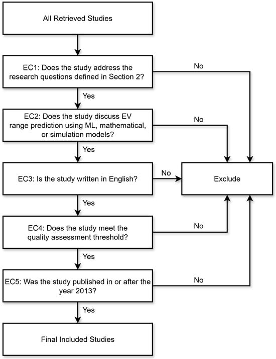 We applied a set of exclusion requirements to filter out papers which is illustrated in Figure 2, which outlines the sequential application of the exclusion criteria (EC1–EC5) and depicts how studies were systematically filtered to obtain the final set of primary studies included in this review. The requirements are: