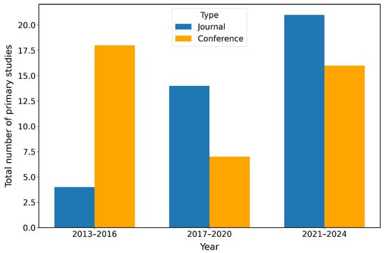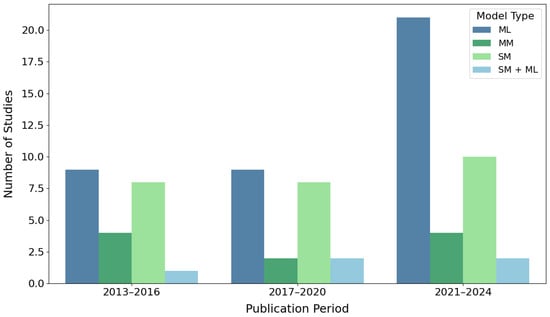 To understand the evolution of research in electric vehicle range prediction, we analyze the distribution over time of the selected studies. This analysis helps identify trends over time and highlights periods of increased research activity. We categorize the studies into three distinct periods: 2013–2016, 2017–2020, and 2021–2024 and visualize in Figure 4.