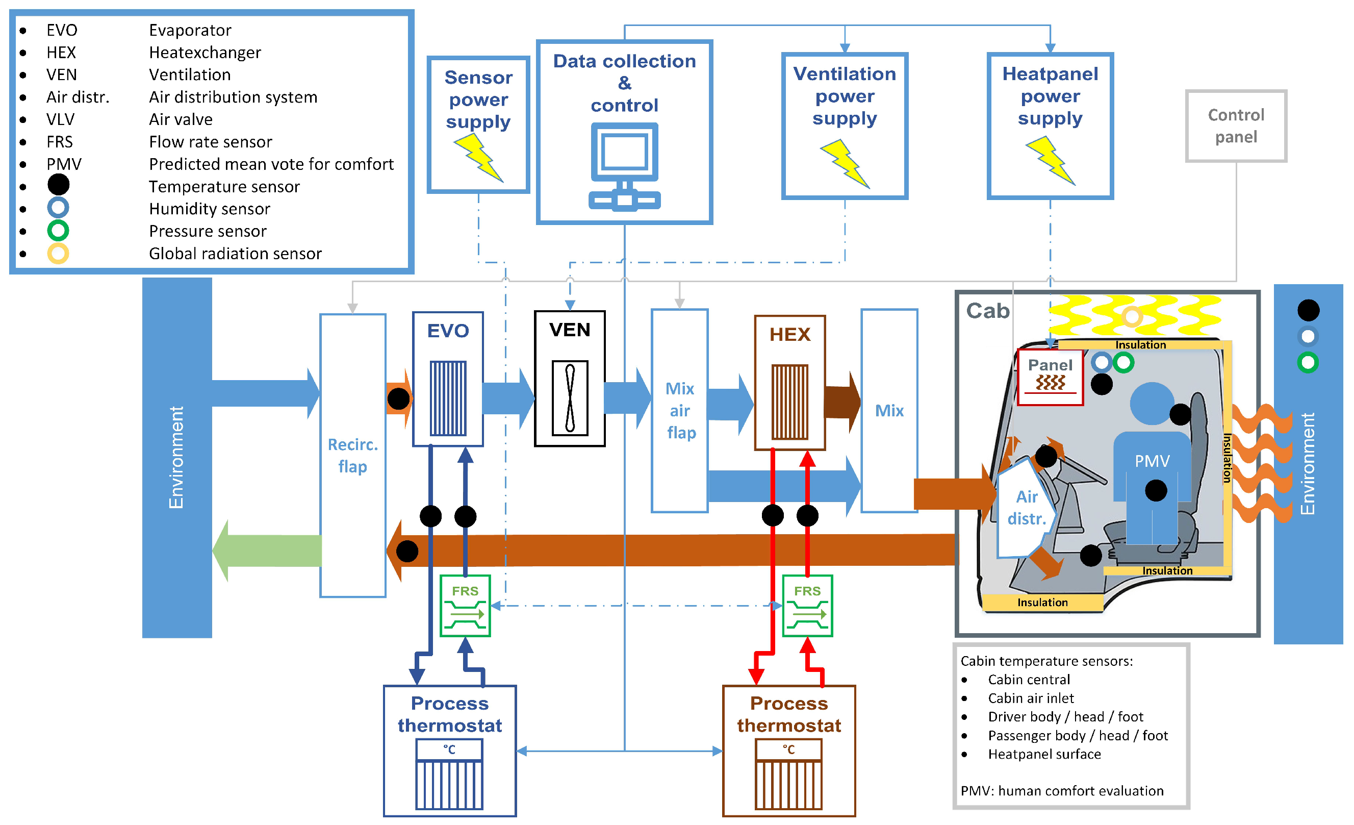 - Dvorak, D.; Kardos, M.; Gellai, I.; Šimić, D. Experimental Performance Investigation of an Air–Air Heat Exchanger and Improved Insulation for Electric Truck Cabins. World Electr. Veh. J. 2025, 16, 129. [Google Scholar] [CrossRef]