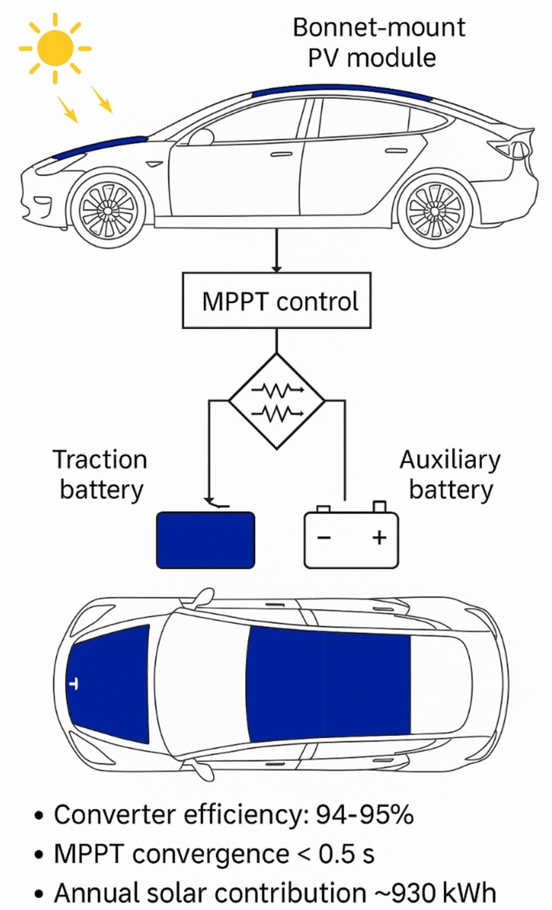 The VIPV system is designed around a light passenger vehicle, with dimensions based on a Tesla Model 3. Major system components include a fixed rooftop/bonnet photovoltaic array, dual MPPT, dual DC-DC buck converters and a traction battery–auxiliary battery fuzzy logic charging controller.