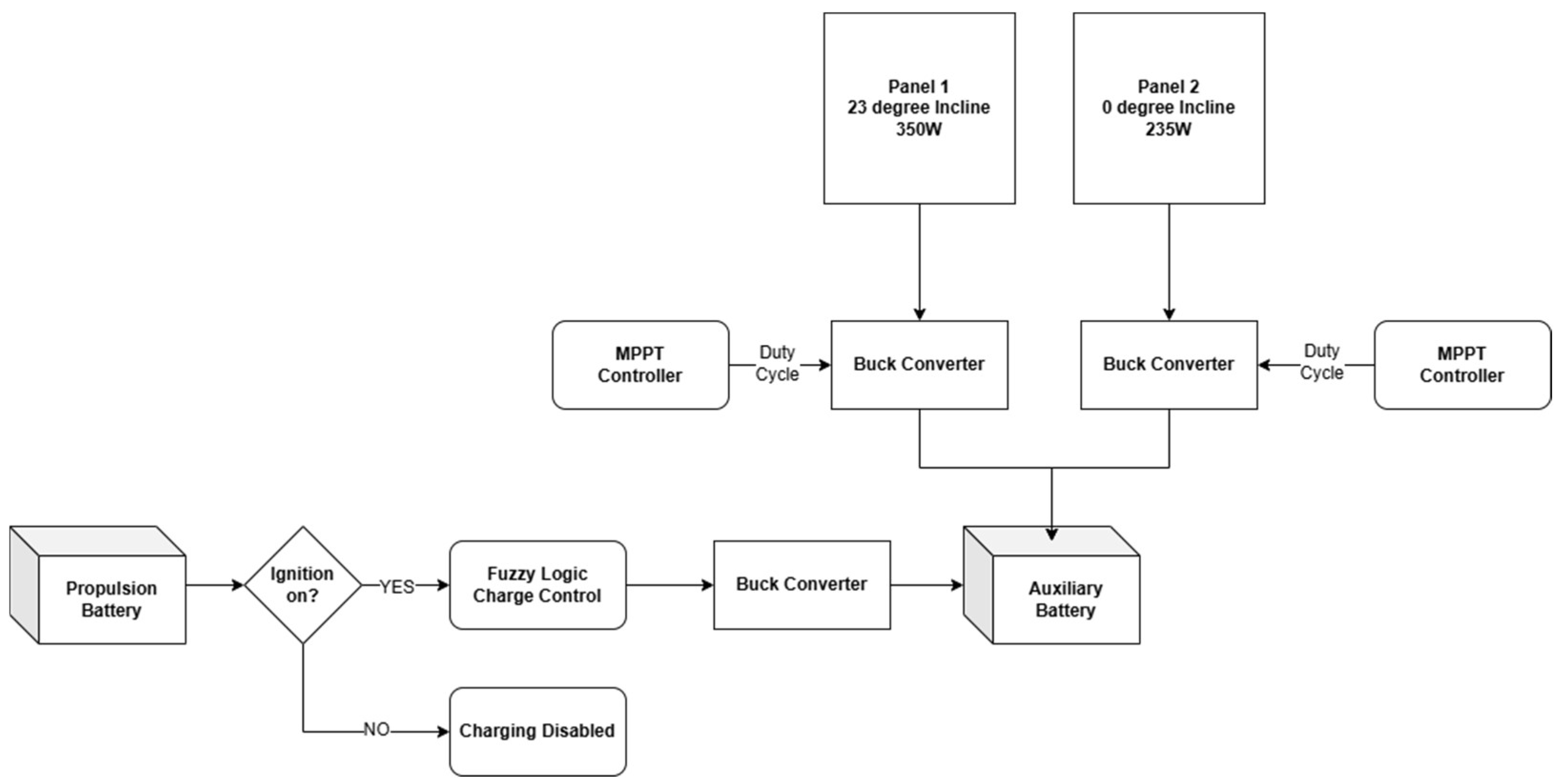 To maximise the utilisation of solar energy, a fuzzy logic controller, based on the Mamdani inference system, controls a DC-DC charger from the main traction battery. This is designed to only charge the auxiliary battery when solar is unavailable or the battery is deeply discharged. The DC-DC charger supports bidirectional energy flow, enabling power to be drawn from the traction battery to supplement the auxiliary battery when solar generation is insufficient, while minimising losses through intelligent load management. The controller takes fuzzy variables for the battery’s state of charge and solar irradiance, compares them to a rule set and varies the output of the DC battery charger accordingly.