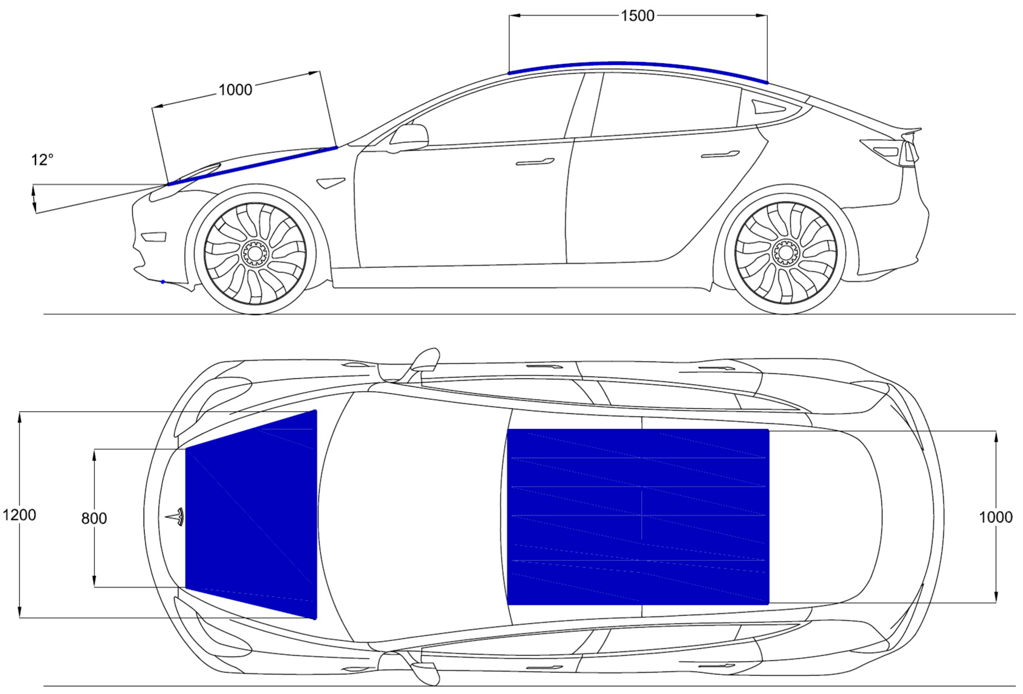 Roof and bonnet curvature also play an important role in optimal power output. Based on a maximum estimated sagitta (height) of 50 mm for the roofline, Formula (1) gives an estimation of curvature.